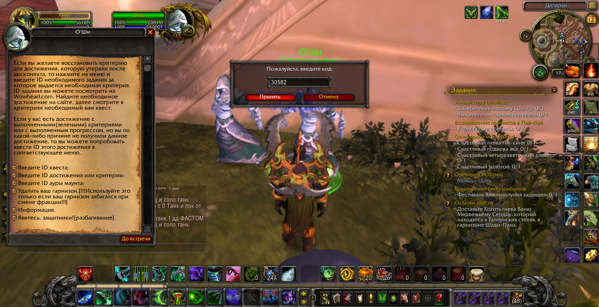 в том скорее всего и проблема что квесты Покойная госпожа Мускусная Лапа(30585) и Повелитель Ужаса(30804) выполнены но при проверке(/run print(IsQuestFlaggedCompleted(30582)) пишет что не выполнены и еще нет нпс в пещере на квест Мускусная Лапа: пропавший сын.При попытке исправить у нпс квест пишет что квест выполнен,скрины прилагаю.