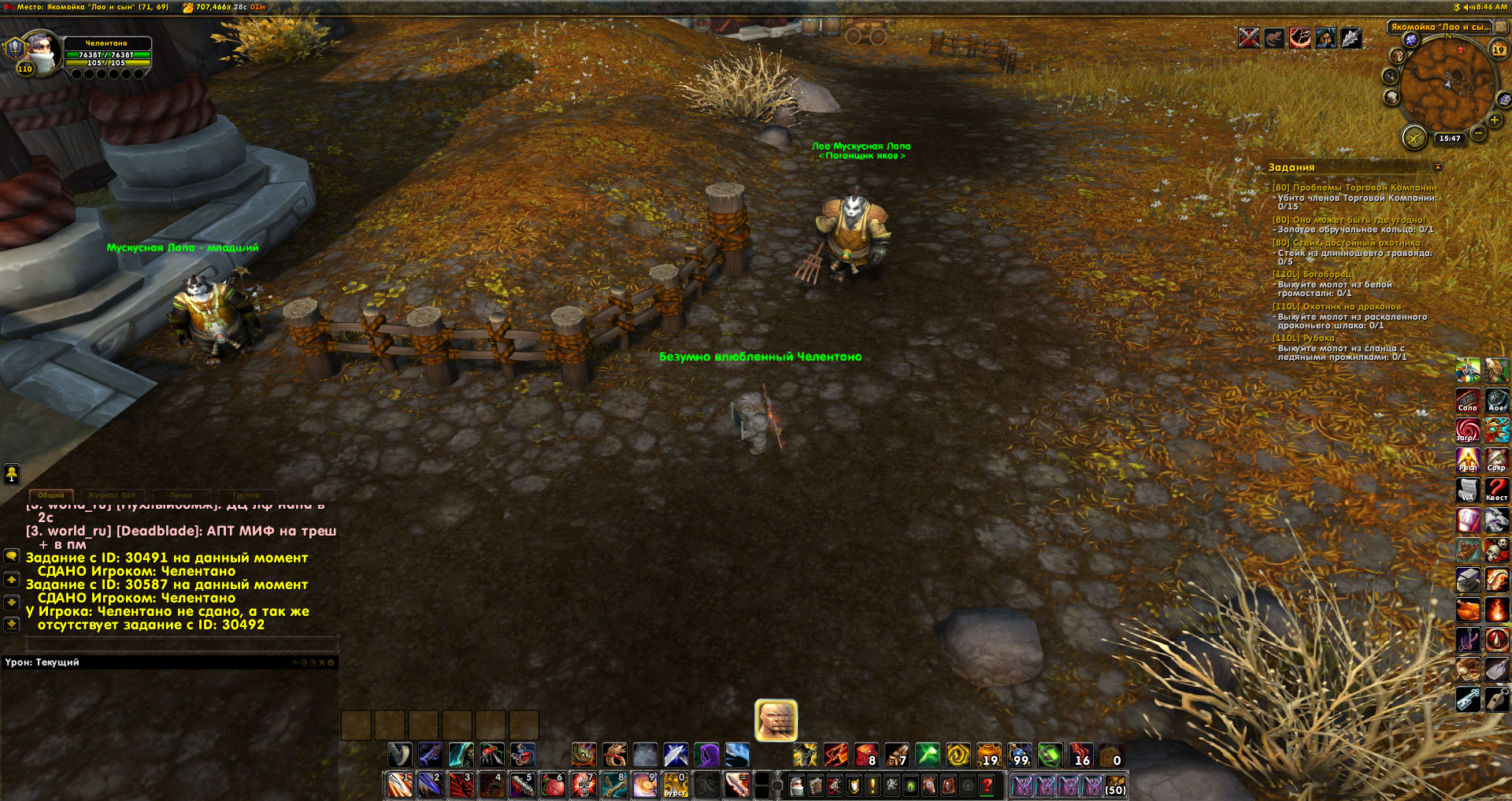 в том скорее всего и проблема что квесты Покойная госпожа Мускусная Лапа(30585) и Повелитель Ужаса(30804) выполнены но при проверке(/run print(IsQuestFlaggedCompleted(30582)) пишет что не выполнены и еще нет нпс в пещере на квест Мускусная Лапа: пропавший сын.При попытке исправить у нпс квест пишет что квест выполнен,скрины прилагаю. |