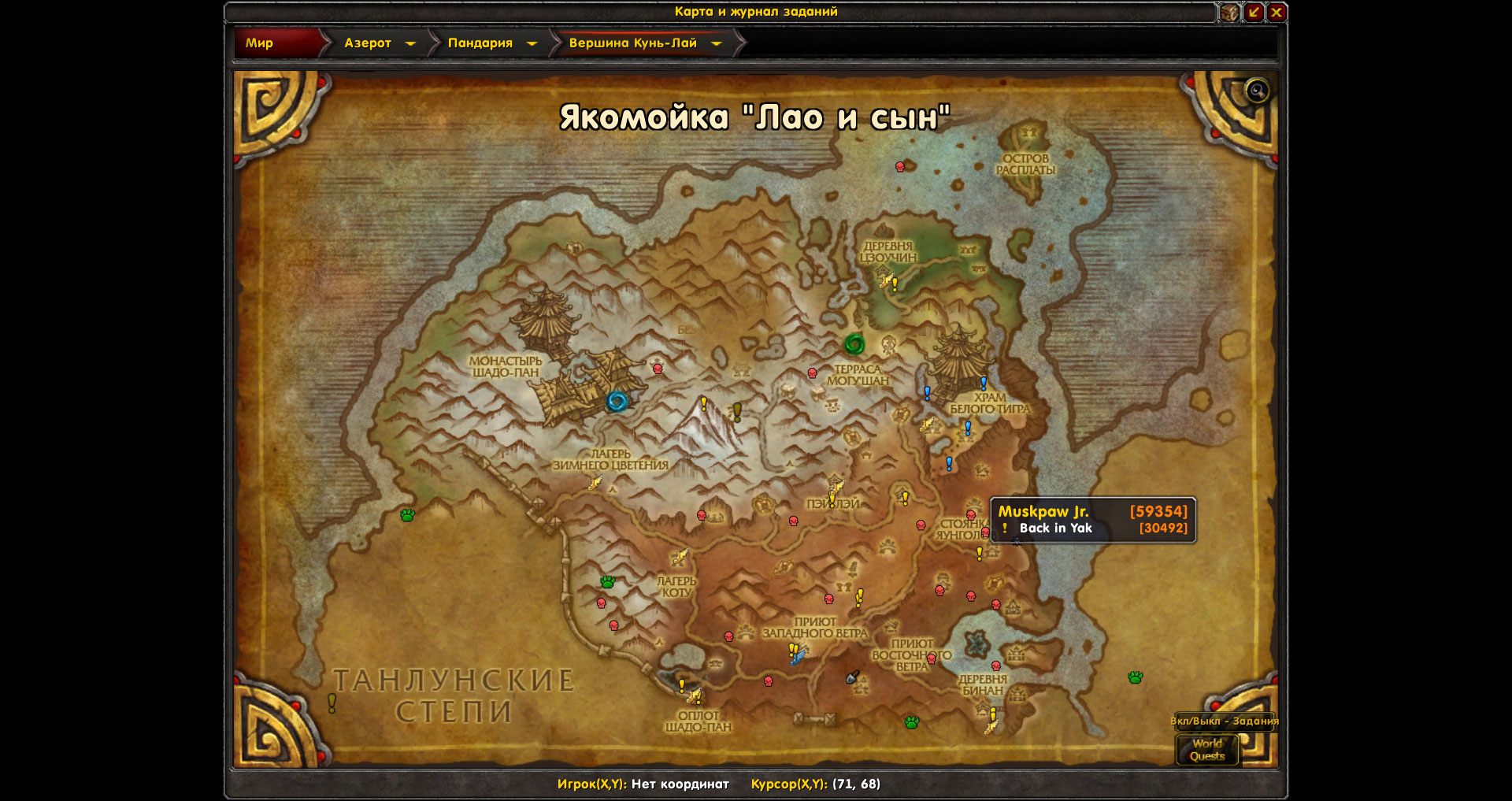 Аналогичная проблема.Не могу выполнить критерий "Якомойка" так как нету доступных квестов в локации.Квесты 30582 и30804 выполнены.Всю локацию облетал и нифига,доступные квесты закончились.Скрины с невыполненными квестами на скрине ниже. WoWScrnShot_021321_004732.jpg (638,689 bytes) |
