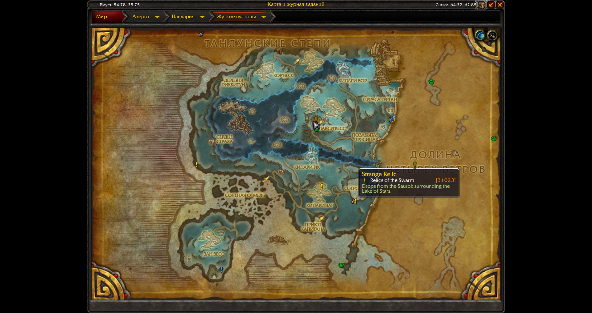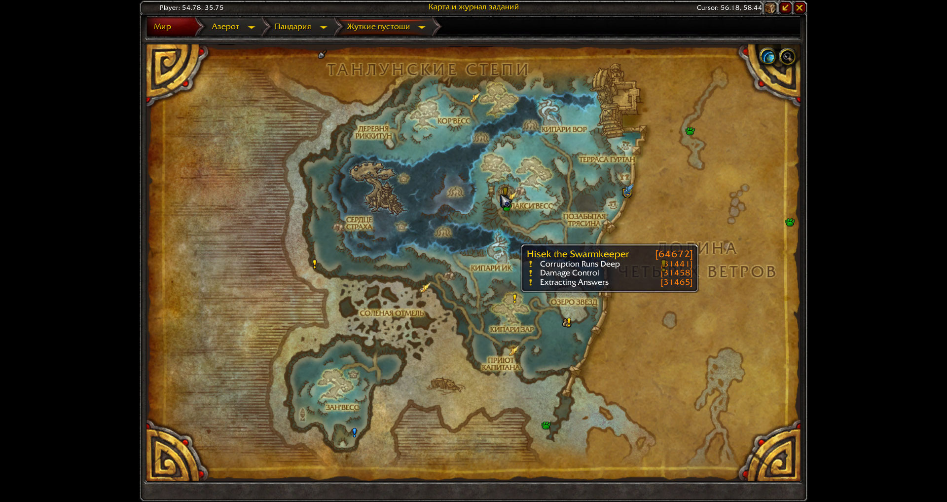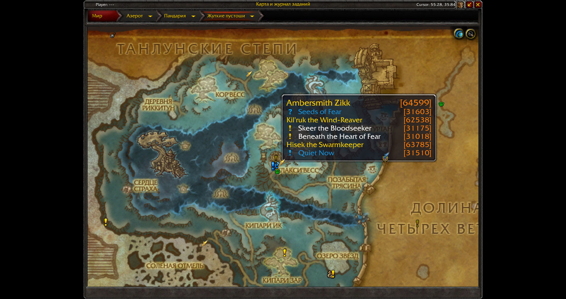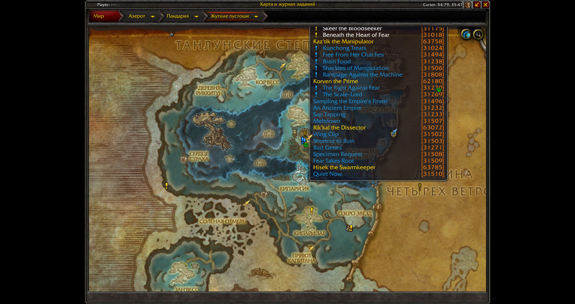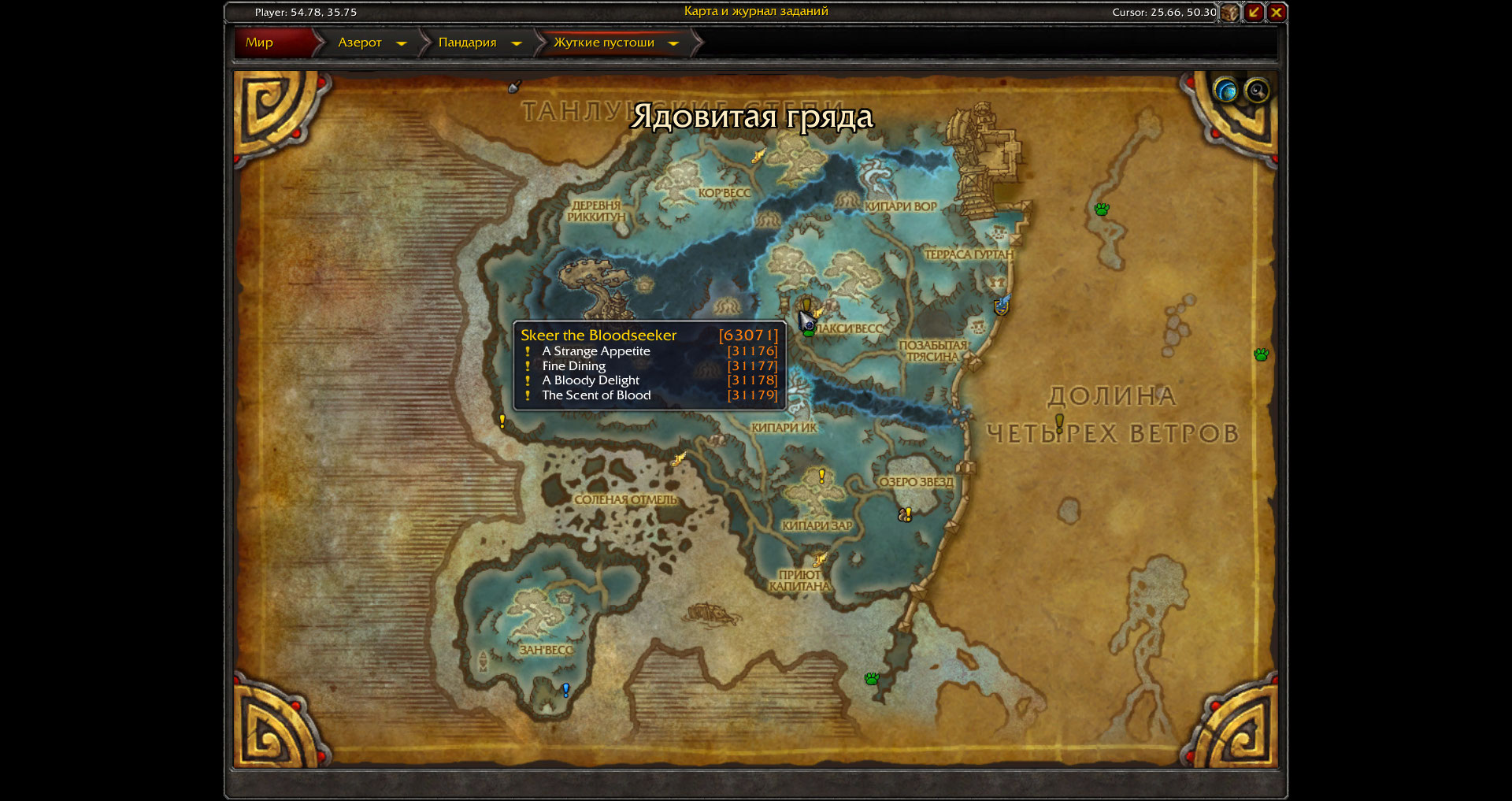 Здравствуйте! Извиняюсь за долгий ответ, чтобы найти нужные квесты для цепочки потребовалось много времени По скрину с картой и квестами, которых у вас нет - вы сюжетку прошли почти полностью, для ачивы не хватает https://ru.wowhead.com/quest=31606 и https://ru.wowhead.com/quest=31179 Остальные два критерия должны были засчитаться, попробуйте подойти к дебагеру и перезачесть квесты 31439 и 31211 Дальше, по первым двум. У вас на них не сделаны цепочки Рассказываю про цепочку с https://ru.wowhead.com/quest=31606 Нужно сделать https://ru.wowhead.com/quest=31605 судя по скрину с картой, вы его сделали (проверку любого квеста вы можете сделать сами, просто введите команду ".q s ID", где вместо ID - номер квеста, он есть в ссылках, которые я вам прикладываю) Поэтому вам нужно слетать к https://ru.wowhead.com/npc=65253 и взять там квест https://ru.wowhead.com/quest=31606 Рассказываю про цепочку с https://ru.wowhead.com/quest=31179 Цепочка начинается с https://ru.wowhead.com/quest=31175 , судя по скрину - вы его сделали Дальше идёте к https://ru.wowhead.com/npc=63071 в пещеру и делаете цепочку https://ru.wowhead.com/quest=31176 https://ru.wowhead.com/quest=31177 https://ru.wowhead.com/quest=31178 https://ru.wowhead.com/quest=31179 |