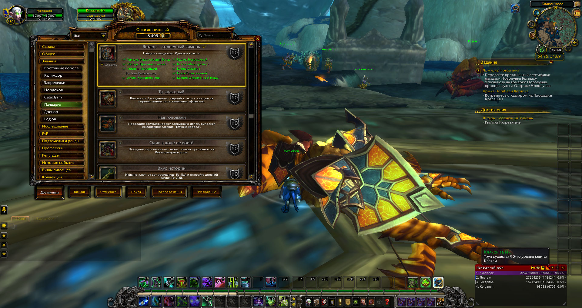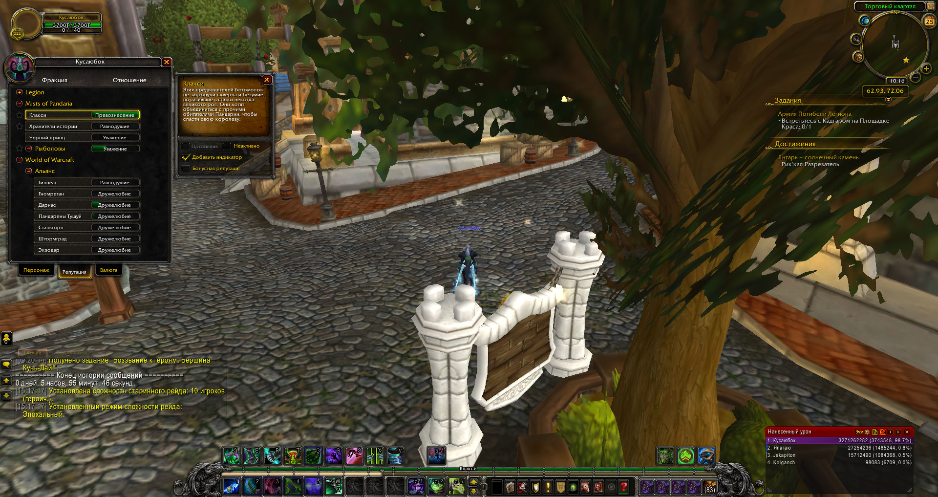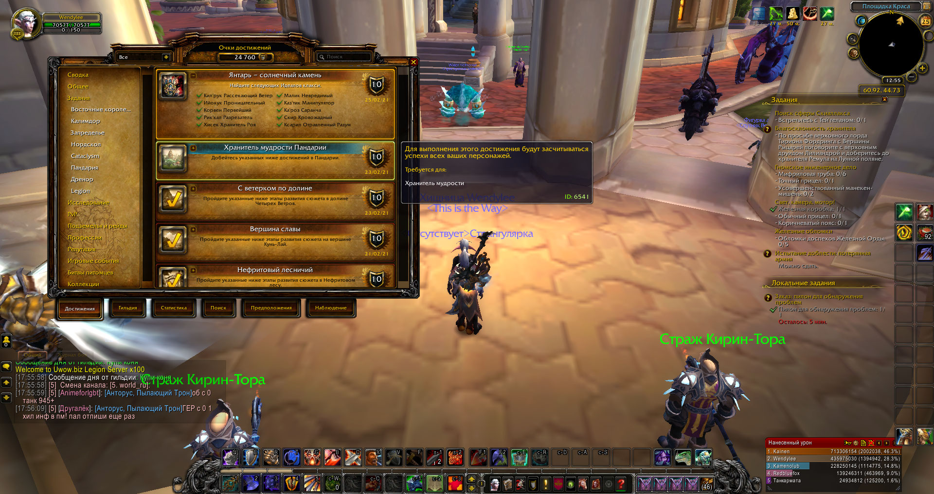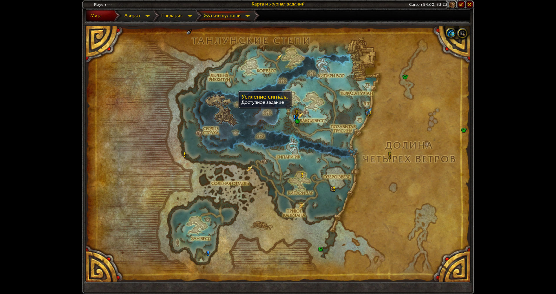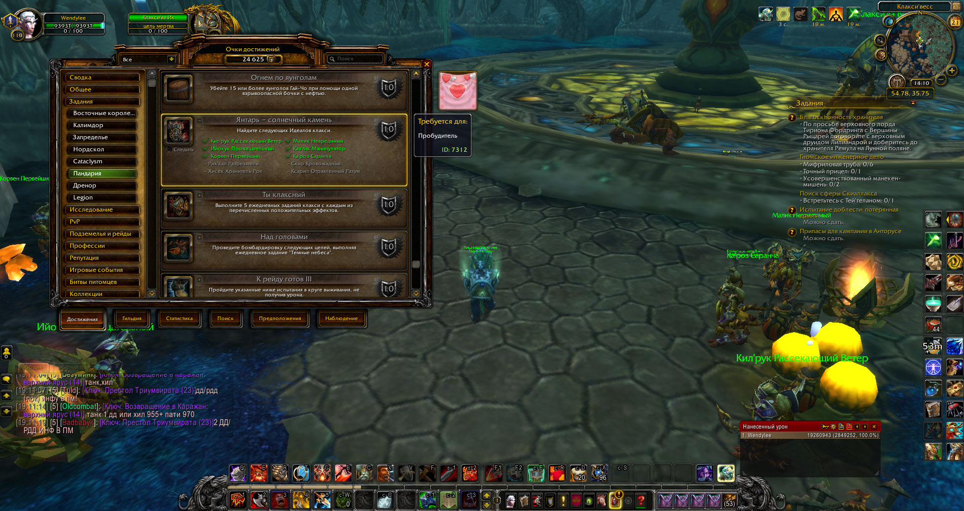 Здравствуйте! Извиняюсь за долгий ответ, чтобы найти нужные квесты для цепочки потребовалось много времени По скрину с картой и квестами, которых у вас нет - вы сюжетку прошли почти полностью, для ачивы не хватает https://ru.wowhead.com/quest=31606 и https://ru.wowhead.com/quest=31179 Остальные два критерия должны были засчитаться, попробуйте подойти к дебагеру и перезачесть квесты 31439 и 31211 Дальше, по первым двум. У вас на них не сделаны цепочки Рассказываю про цепочку с https://ru.wowhead.com/quest=31606 Нужно сделать https://ru.wowhead.com/quest=31605 судя по скрину с картой, вы его сделали (проверку любого квеста вы можете сделать сами, просто введите команду ".q s ID", где вместо ID - номер квеста, он есть в ссылках, которые я вам прикладываю) Поэтому вам нужно слетать к https://ru.wowhead.com/npc=65253 и взять там квест https://ru.wowhead.com/quest=31606 Рассказываю про цепочку с https://ru.wowhead.com/quest=31179 Цепочка начинается с https://ru.wowhead.com/quest=31175 , судя по скрину - вы его сделали Дальше идёте к https://ru.wowhead.com/npc=63071 в пещеру и делаете цепочку https://ru.wowhead.com/quest=31176 https://ru.wowhead.com/quest=31177 https://ru.wowhead.com/quest=31178 https://ru.wowhead.com/quest=31179 |