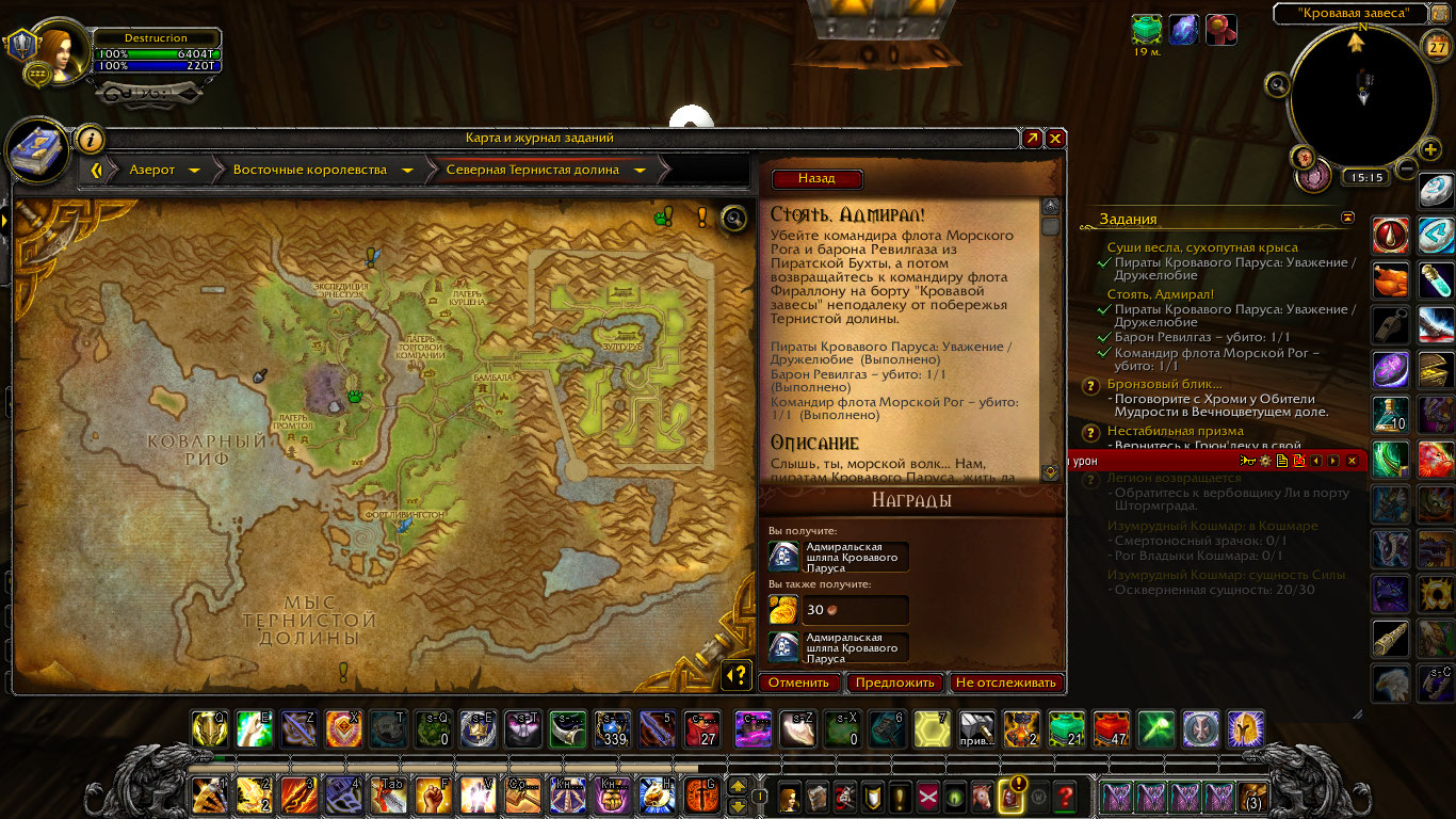 Здравствуйте! Чтоб сделать квест, вы должны выполнить 4 критерия - Барон Ревилгаз убито - Командир флота Морской Рог убито - Пираты Кровавого Паруса (Дружелюбие) - Пиратская Бухта (Ненависть) Вы все 4 критерия выполнили? |