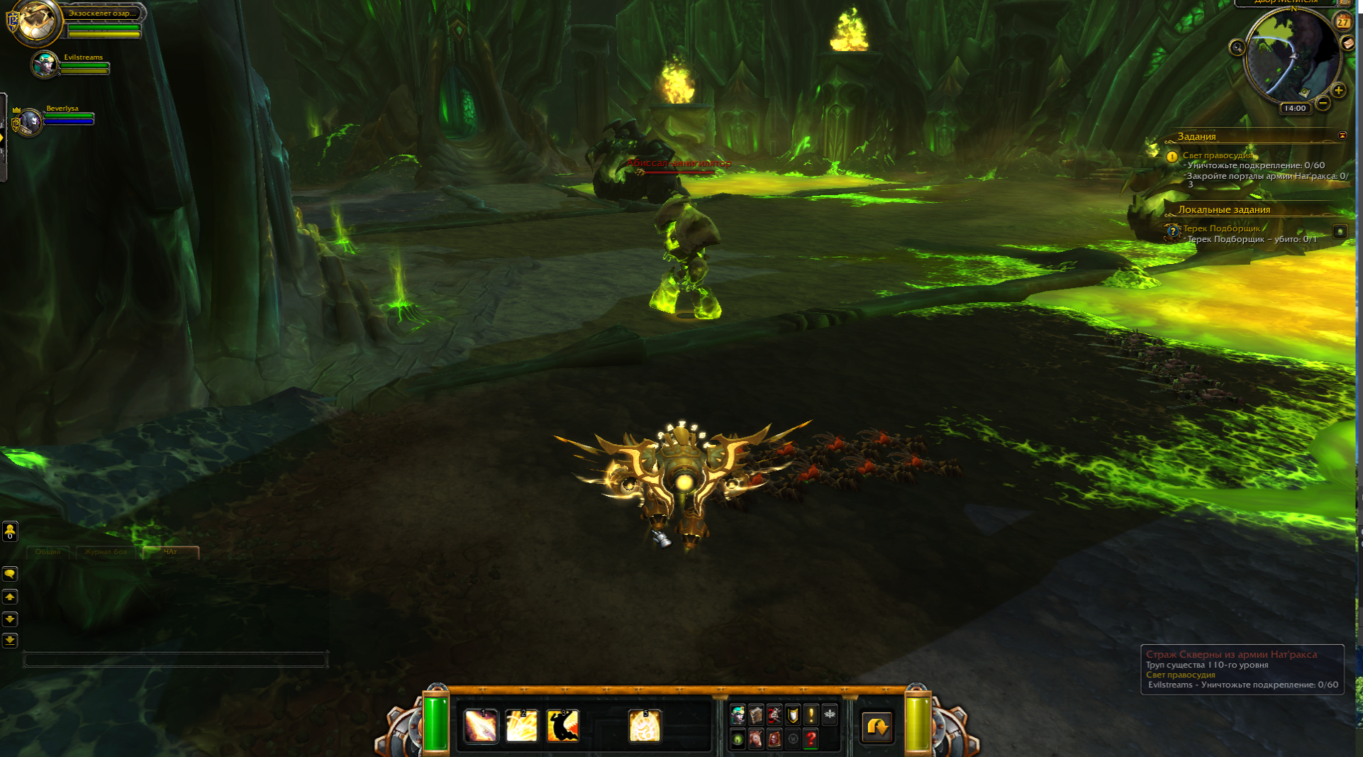 | Description | 1.Evilstreams 2. https://ru.wowhead.com/quest=47992/%D1%81%D0%B2%D0%B5%D1%82-%D0%BF%D1%80%D0%B0%D0%B2%D0%BE%D1%81%D1%83%D0%B4%D0%B8%D1%8F Забагался квест, где нужно убить 60 мобов и закрыть 3 портала с помощью Экзоскелета. 60 мобов убиваются, а порталы которые нужно закрыть не отображаются. Ждали рес примерно час, не появляются. С отмененным квестом порталы отображаются корректно. На скрине видно, что порталов нет. | ||||