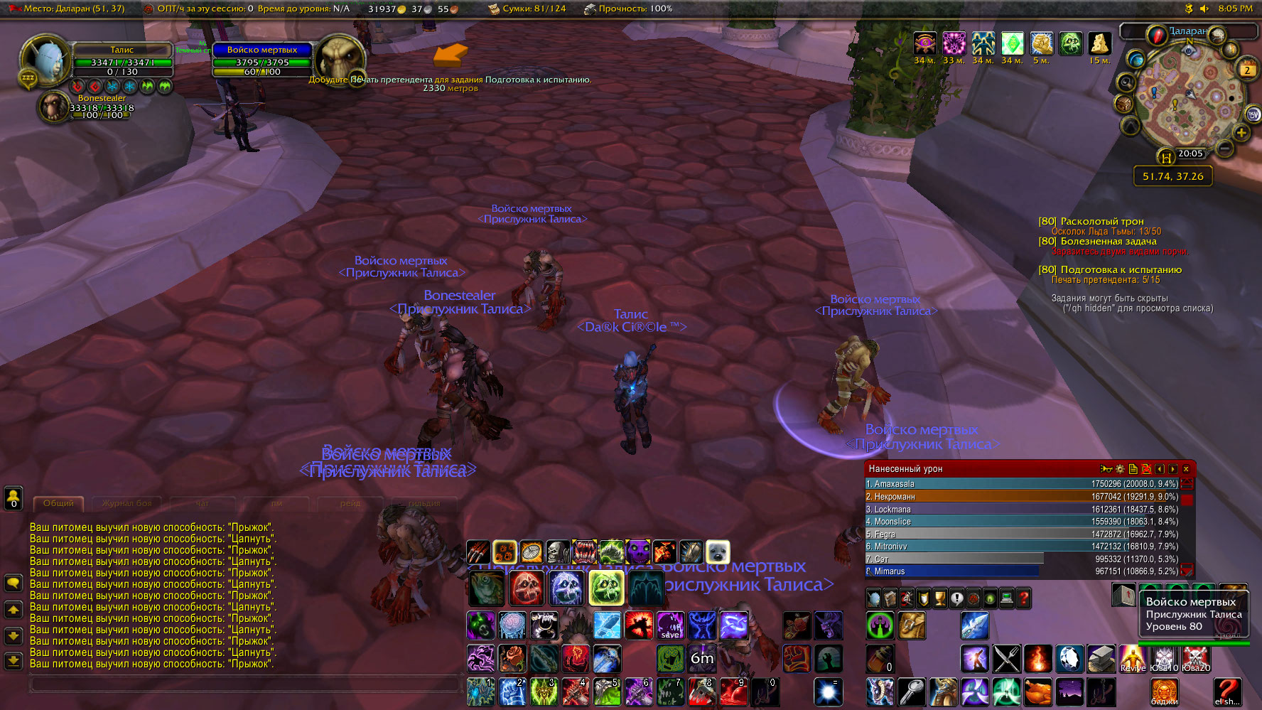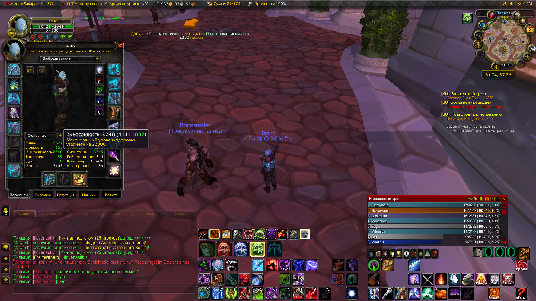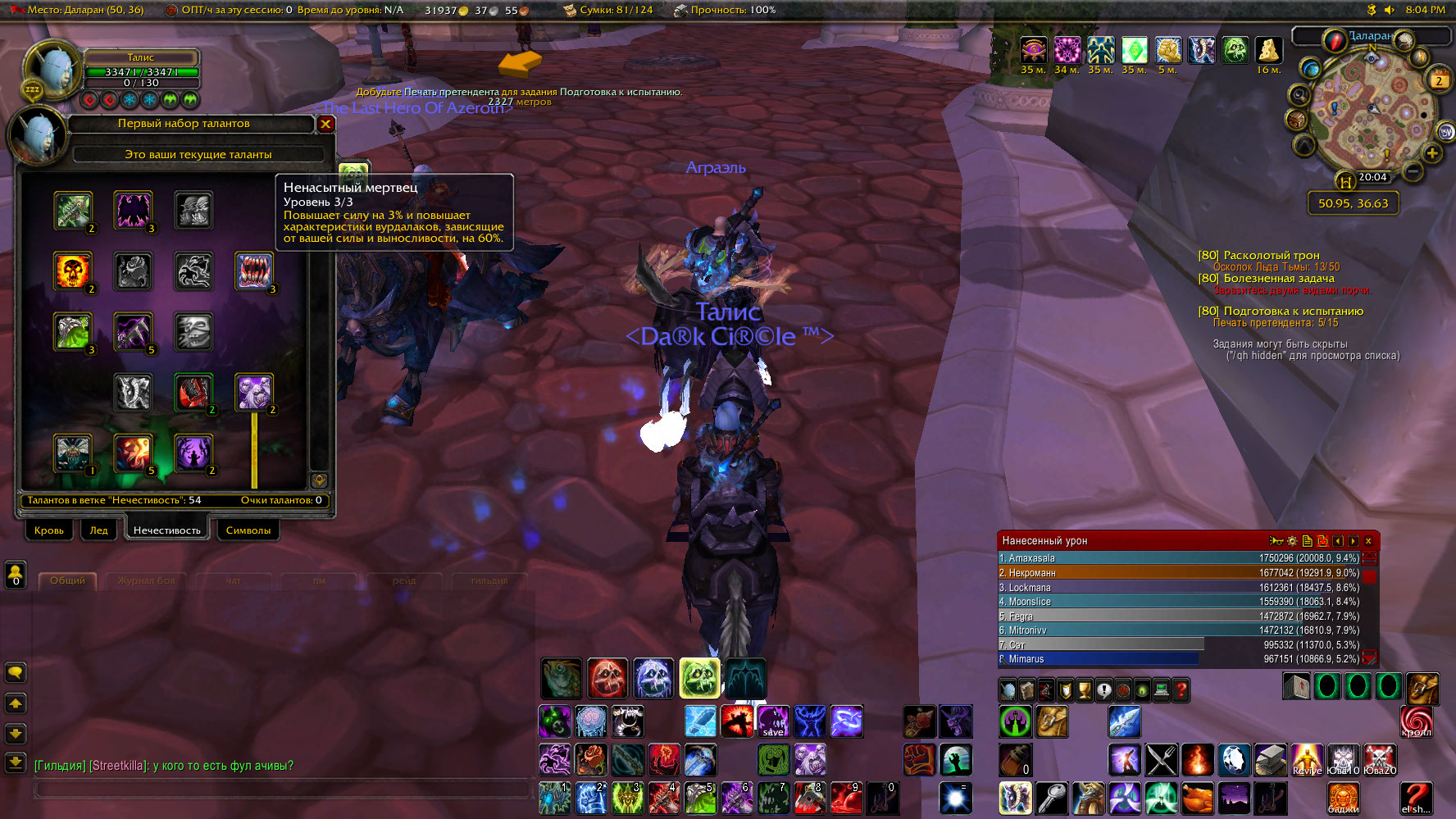 | Description | Скилл Рыцаря Смерти - Войско мертвых не скалируется от таланта Ненасытный мертвец (скриншот-1), который повышает характеристики, силу и выносливость, призванных вурдалаков на 60% от характеристик призывателя. На данный момент призванные вурдалаки имеют базовое количество здоровья по умолчанию встроенное в данный скилл (скриншот-2). Приведу пример расчета формулы увеличения ХП, для наглядности, на примере конкретного Рыцаря Смерти. Без баффов Рыцарь Смерти имеет 2248 выносливости (скриншот-3), которые увеличивают Максимальный уровень здоровья на 22300 единиц. Коэффициент прибавки здоровья на единицу выносливости будет примерно равен следующему значению - 22300/2248 = 9,9 (округлил до одного знака после запятой, т.к. получается число в прогрессии). Следуя описанию таланта - 60% стата Выносливость Рыцаря Смерти переносится призванным вурдалакам, что в данном случае составит 22480,6 = 1348,8 выносливости. Т.е. перемножив полученное значение 60% выносливости на коэффициент здоровья, получим 1348,89,9 = 13353,2 ХП талант Ненасытный мертвец должен прибавлять к здоровью Вейска мертвых. В данном случае здоровье призванных вурдалаков должно составлять (базовое значение + бонусное здоровье от таланта) 3795 + 13353,12 = 17148,12 единиц, вероятно округленное до ровного значения в меньшую сторону. | ||||