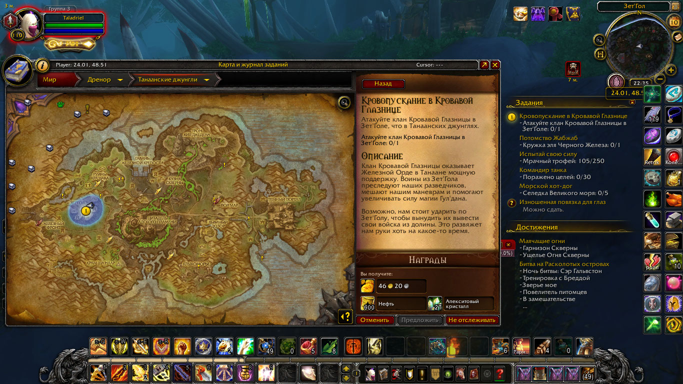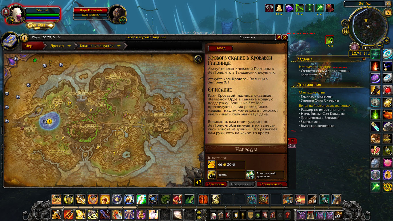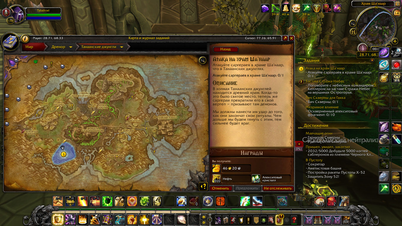 Пять копеек. ну может чуть больше... https://ru.wowhead.com/guides/quests/completing-6-2-tanaan-assault-dailies-and-bonus-objectives почитать гайд. можно воспользоваться автопереводчиком Хрома или перевести другим способом, если не понятен английский. По дейликам - в теории в сутки должны быть доступны рандомно два дейлика из общего количества. Но было замечено, что после очередного обновления в начале прошлого года вообще перестали автоматически выдаваться дейлики при въезде в зону выполнения дейлика (как у ТС). В то же время , если взять у НПС квест https://ru.wowhead.com/quest=39574/%D1%80%D0%B0%D0%B7%D0%B2%D0%B8%D1%82%D0%B8%D0%B5-%D0%B0%D1%82%D0%B0%D0%BA%D0%B8 / https://ru.wowhead.com/quest=39526/%D1%80%D0%B0%D0%B7%D0%B2%D0%B8%D1%82%D0%B8%D0%B5-%D0%B0%D1%82%D0%B0%D0%BA%D0%B8 , то с этим квестом Атаки на указанные зоны таки выдаются , засчитываются и дейлики можно сдать. Причем одновременно с дейликом засчитывается и второй вариант этого квеста, или как доп задача или как дейлик противоположной фракции. За некоторые из них награда выдается как за локалки Легиона - сразу в полном объеме. В общем совет - последовательно пройти все этапы кампании Танаанских джунглей, взять у НПС квест Развитие атаки и не сдавать его (во избежание) пока не будет нафармлено репу, кристаллы и прочее. Да, еще - желательно имель свободные слоты в списке заданий, чтобы квесты с автопринятием могли автоматически активироваться. Почистите список от квестов типа "Испытай свою силу", если не собираетесь их выполнять параллельно с квестами в танаане. |