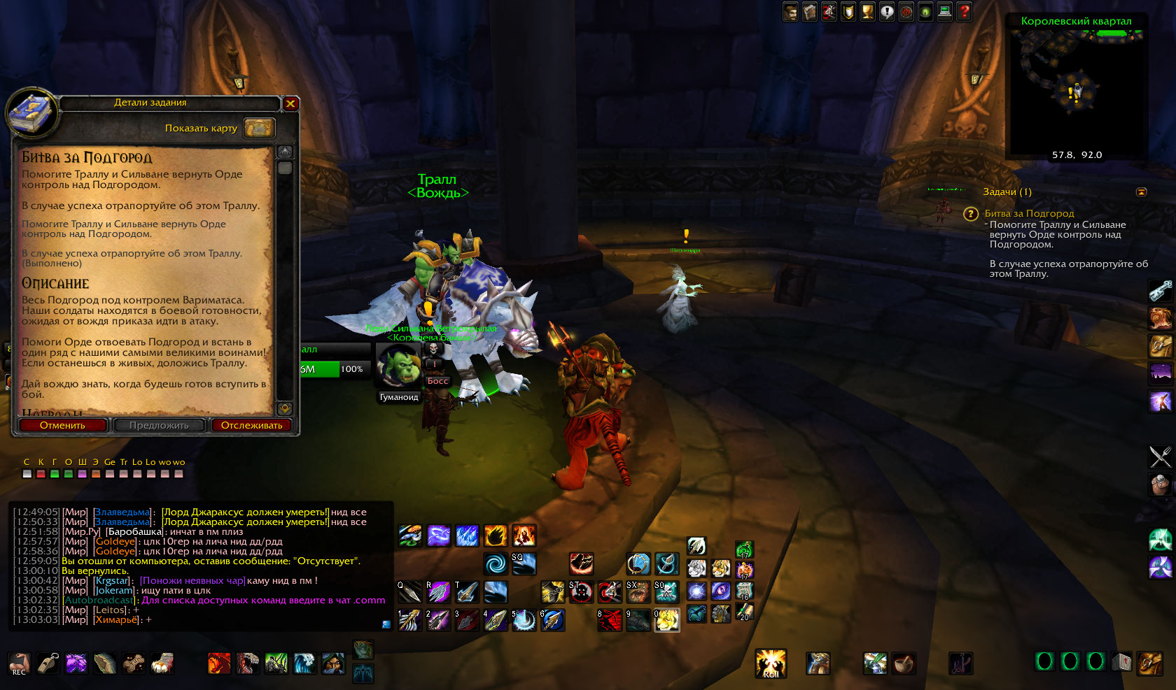| Description | Успешно выполнил необходимую цепочку квестов для получения достижения "Ветеран Врат Гнева". Последующий же, финальный квест "Битва за Подгород" никак не хочет адекватно работать - как и необходимо, беру квест у Вол`Джина, стоящего перед входом в Подгород, при этом в журнале заданий у квеста сразу стоит статус "Выполнено". Появляются войска Орды, активирую Тралла через диалог, он проходит через ворота и, если в этот момент побежать за ним, скрипт будто останавливается - НПС исчезают. При этом, подойдя к Траллу в Подгороде, нет возможности завершить выполненное, якобы, задание. | ||||