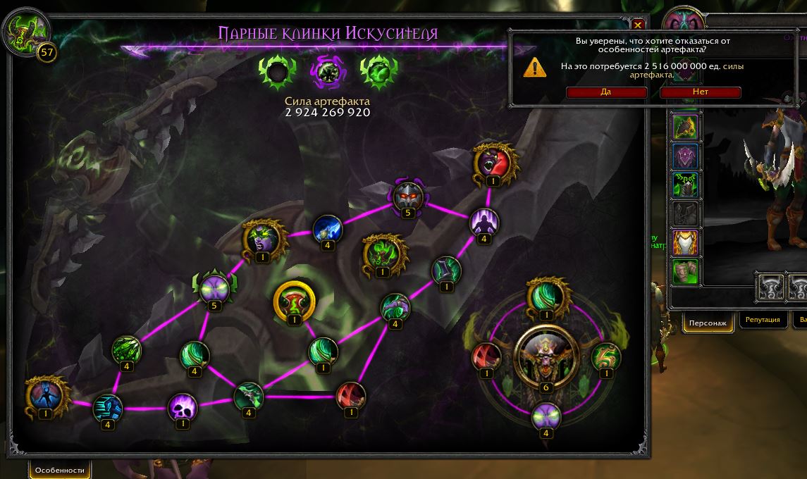 Здравствуйте makcimys93 , пожалуйста, формулируйте свои утверждения так, чтобы у игроков не возникало сомнений. Я правильно понял Вас, что Вы подтверждаете наличие следующего бага: Невозможность сброса и повторного распределения особенностей артефакта после того, как все особенности будут активированы, включая расширенный набор особенностей. И что влияние этого бага распространяется только на невозможность выполнения квеста "Великая сила для великих дел" после распределения особенностей свыше 52 уровня. На активацию особенностей после первичного распределения этот баг никак не влияет и артефакт работает как и должен работать. dondon не понимает и не хочет понимать, что для активации любой особенности требуется влить от 1 до 7 порций СА, независимо от того, связана ли эта особенность с другими посредством зависимостей или нет. если на особенности стоит знак "1/1" (или 4/4) то она полностью активна. dondon не понимает и не хочет понимать, что каждая из трех реликвий, устанавливаемых в слоты артефакта содержит в своих параметрах в том числе и плюсик к той или иной особенности артефакта. То есть с установленными реликвиями какая либо особенность получит увеличение с "4/4" на "5/5" и вплоть до "7/7" если все три реликвии будут подобраны с бустом одинаковой особенности. |