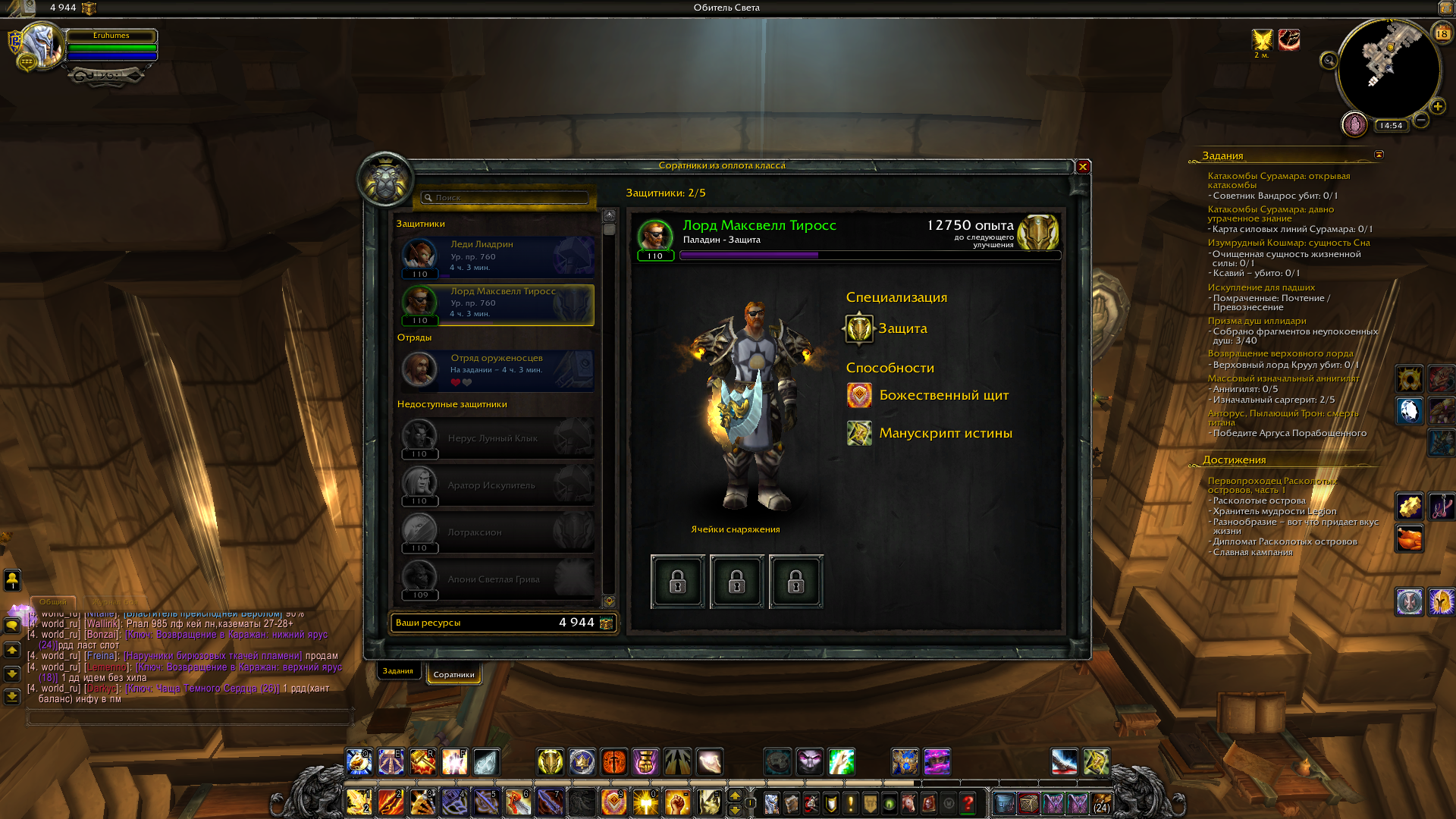 вот здесь тестер дал ссылку на аддон BtwQuests http://tracker.legionbugs.com/view.php?id=13846 скачайте, установите аддон, после запуска клиента на ободе радара появится значок-книжка. в коне аддона левая верхняя кнопка - квесты кампании оплота, как они должны идти в правильном порядке. Смотрите, на каком квесте остановилась цепочка, по названию на поисковике https://cse.google.com/cse?cx=010862021562215402367:xjjllmkh5ms ищите описание квеста и читайте где и как его выполнить. Это поиск на ru.wowhead.com Соратников у паладина доступно намного больше четырех. Но одновременно можно держать активными не более 6-7 |