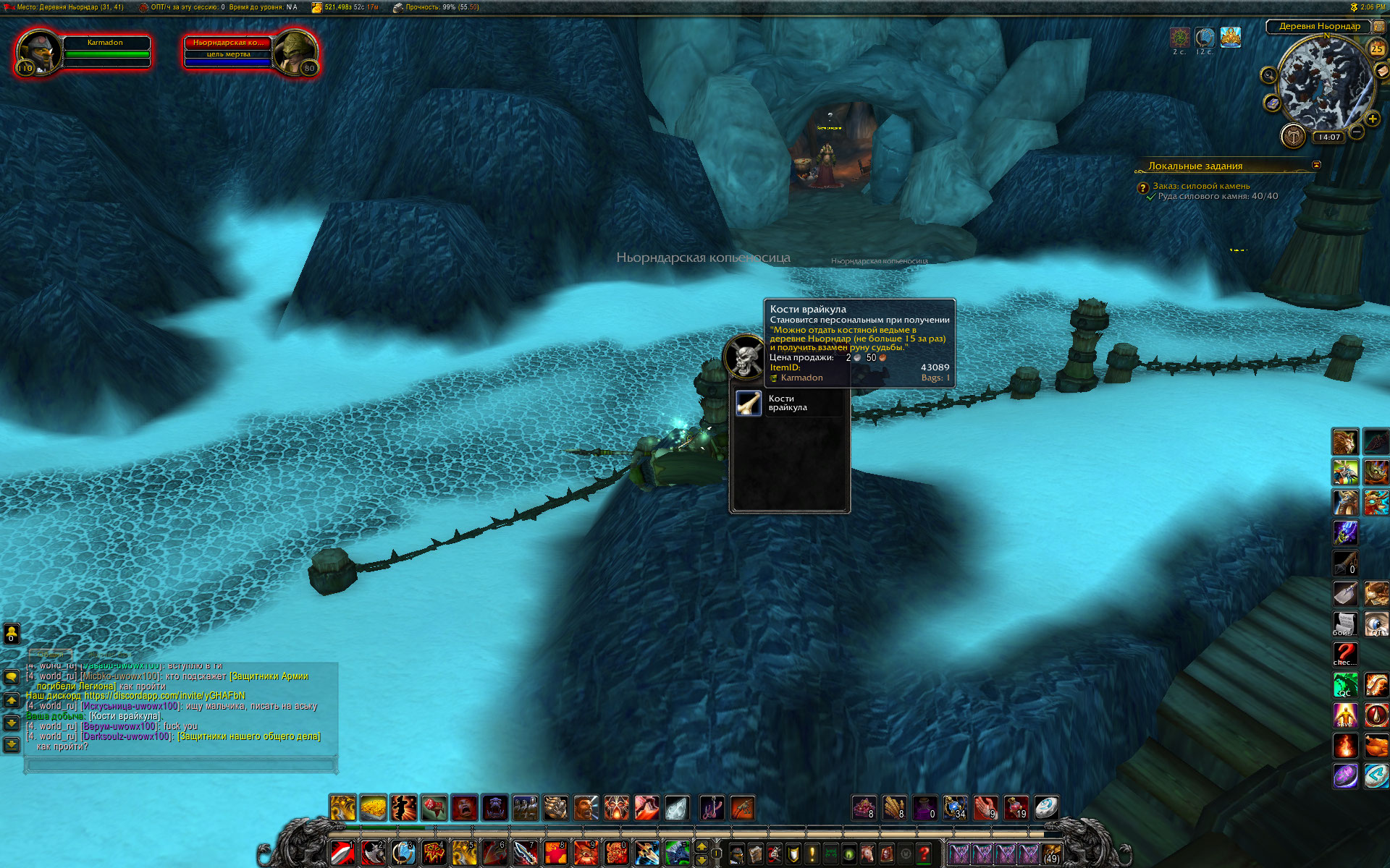 У меня в квест-журнале отображался одноразовый квест 13092. повторяющийся (многоразовый) 13093 у меня в журнале не отображается и доступен только в виде госсипа у ведьмы на сдачу костей. Проверить еще и корректность 13093 сразу не получилось, так как кости перестали падать после сдачи 13092. Проверьте у себя, какой из квестов висит в книге 13092 или 13093. Надеюсь, аддон idTip у Вас уже установлен? Вероятность, что в этой цепочке есть квесты с зависимостью от расы - крайне низкая. Тогда уж скорее квесты зависят от имени персонажа. Вы знаете как звали персонажа, на котором VietnamFlashbacks проверял квест? И я не знаю, а у него квест работает, как и у меня. Это если говорить только о квесте 13092. Я повторю свои выводы - итем https://ru.wowhead.com/item=43089/%D0%BA%D0%BE%D1%81%D1%82%D0%B8-%D0%B2%D1%80%D0%B0%D0%B9%D0%BA%D1%83%D0%BB%D0%B0 должен падать с любых врайкулов по всей зоне Ледяной короны, независимо от наличия какого либо квеста. Не падают - баг. квест 13093 - репутационный - не должен появляться в квест-журнале (или должен, как решит разраб) и его можно сдавать неограниченное количество раз, но только после завершения цепочки преквестов и одноразовой версии квеста (13092). не баг - были бы кости , можно было бы сдавать и сдавать. квесты, необходимые для достижения Хранитель мудрости нужно делать, если требуется достижение и можно не делать, если не требуется. |
