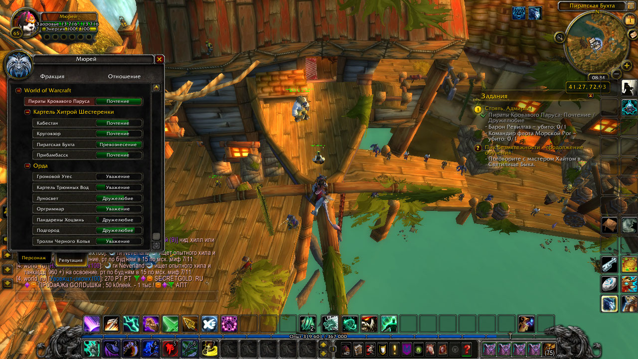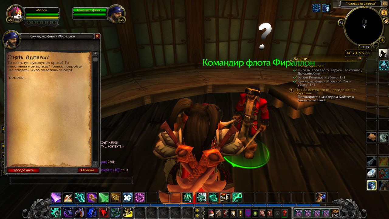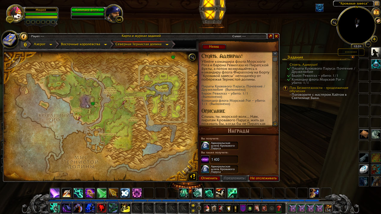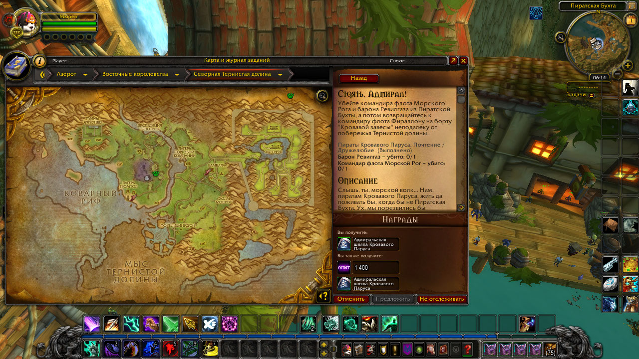| Description | Попал в затруднительное положение с квестом в Пиратской бухте. Если это баг, то почините пож, если я что не так делаю, то подскажите. Судя по всему, здесь проблема с репутацией, но мне непонятно как и куда ее двигать. Мобы, которых надо убить, ко мне дружелюбны, а которые квесты дают стали враждебные. Многоглаз стал враждебный и не дает квест Пушка старушка, а барон Ревилгаз и Морской рог стали зеленые и не агрятся. Режим пвп не помог. | ||||