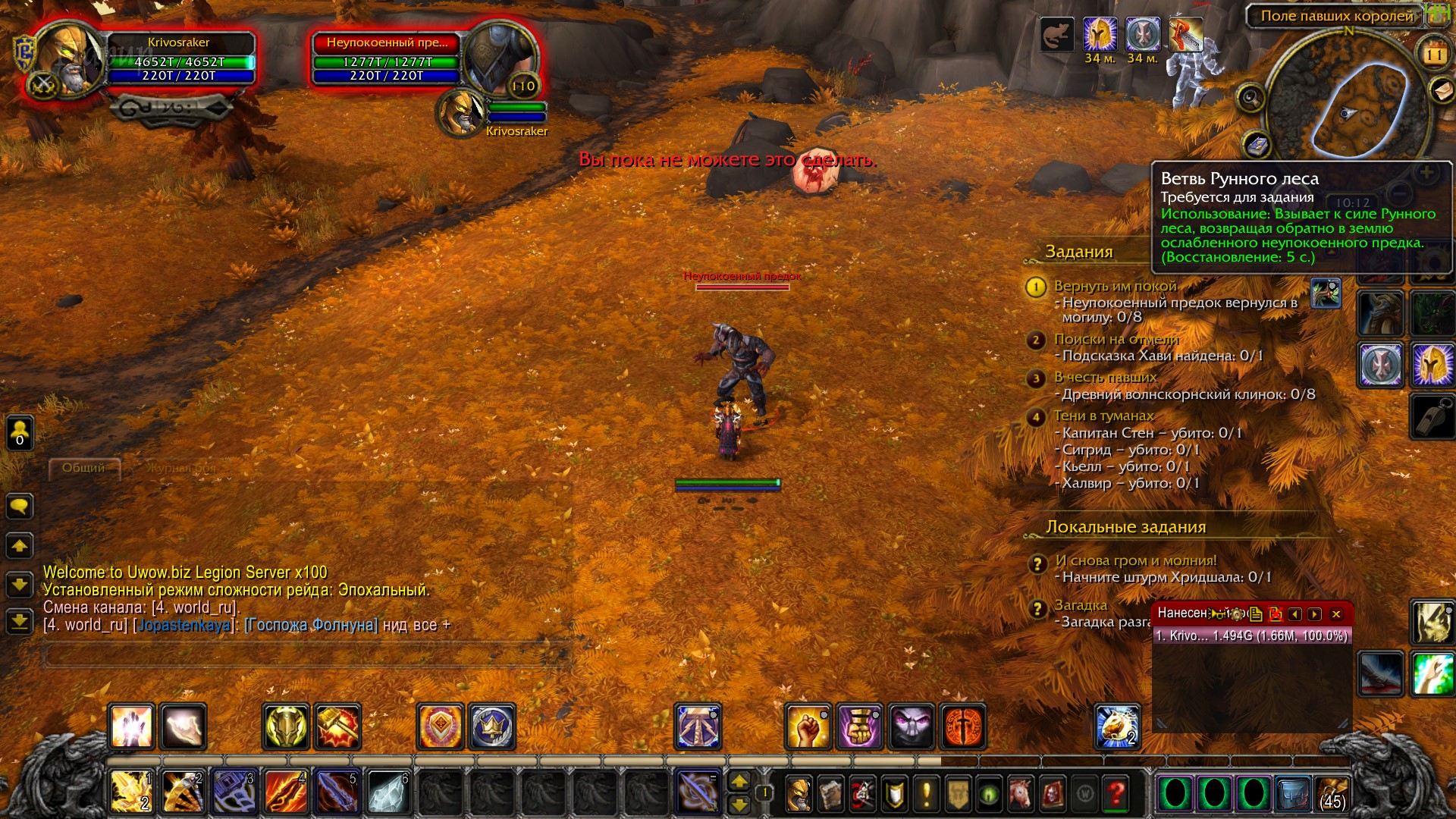 | Description | Квест https://ru.wowhead.com/quest=39791/вернуть-им-покой не работает. при прожатии "Ветвь рунного леса" https://ru.wowhead.com/item=128772/ветвь-рунного-леса на моба "Неупокоенный предок" высвечивается сообщение "Вы пока не можете этого сделать". Этот квест является одним и составляющих цепочки "Испытание доблести". | ||||