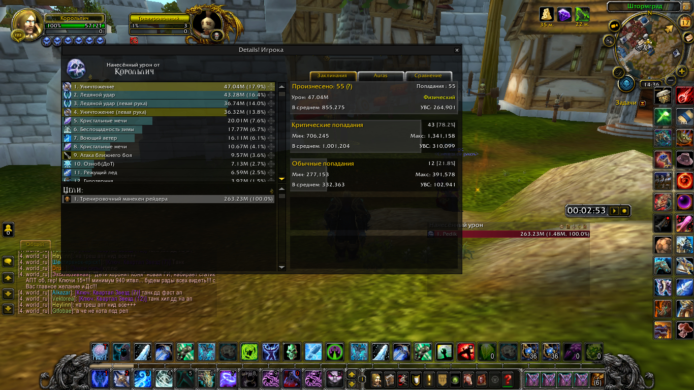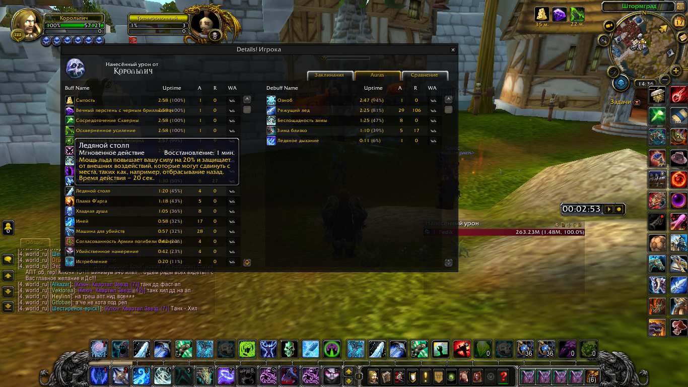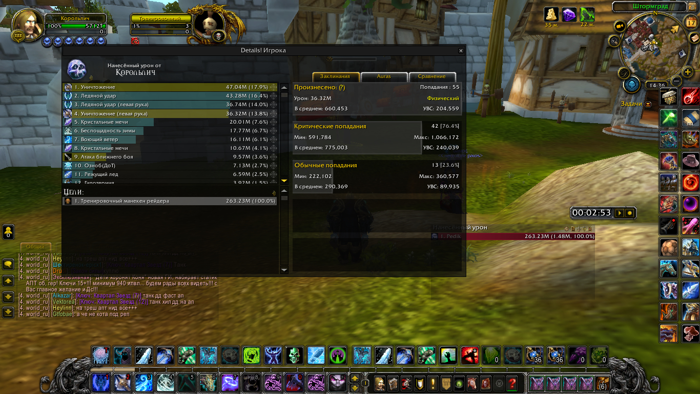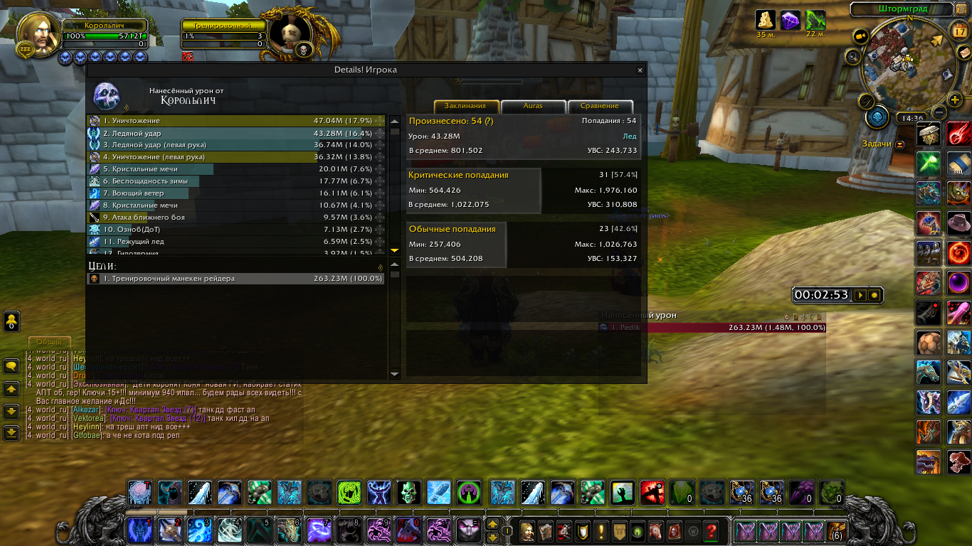 | Description | Я заметил, что если уничтожение или ледяной удар кританёт 1 юза кританёт обоими руками, оно скинет 1 сек, вместо 2. Чтоб проверить как на офе пашет, я решил проверить с логом 1 фрост дк https://www.warcraftlogs.com/reports/1JxWVHYt7gDw8cKN#fight=22&type=damage-done&source=30 . У него было 85 критов от уничтожение и 36 критов от ледяного удара, что в суме даёт 121 крит аптайм ледяного столба был 49%. У меня на манекене 85 критов от уничтожения и 60 от ледяного удара, что вместе даёт 145 критов, аптайм был 45%. Манекен бил я 2:53, а левый пацан с логов убил матраса за 2:57 сек. у него выше аптайм, чем у меня на 4%, так у меня должно было быть выше. на скринах видно аптайм и кол-во критов. | ||||
