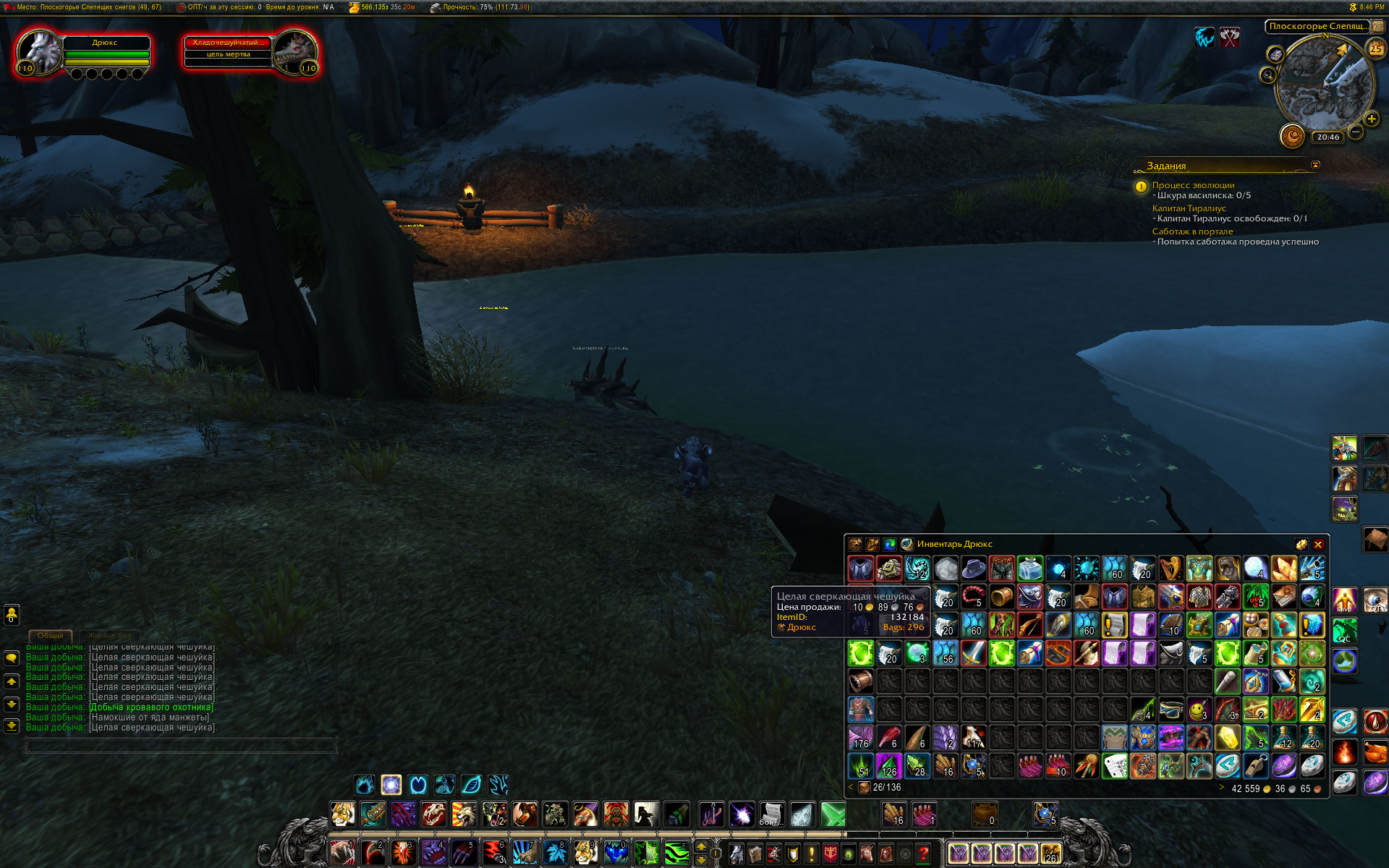 | Description | Забавный баг - по квесту https://ru.wowhead.com/quest=40204/%D0%BF%D1%80%D0%BE%D1%86%D0%B5%D1%81%D1%81-%D1%8D%D0%B2%D0%BE%D0%BB%D1%8E%D1%86%D0%B8%D0%B8#comments требуется получить 5 единиц квестовых предметов https://ru.wowhead.com/item=130100/%D1%88%D0%BA%D1%83%D1%80%D0%B0-%D0%B2%D0%B0%D1%81%D0%B8%D0%BB%D0%B8%D1%81%D0%BA%D0%B0 с мобов https://ru.wowhead.com/npc=108185/%D1%85%D0%BB%D0%B0%D0%B4%D0%BE%D1%87%D0%B5%D1%88%D1%83%D0%B9%D1%87%D0%B0%D1%82%D1%8B%D0%B9-%D1%81%D0%BC%D0%B5%D1%80%D1%82%D0%BE%D0%B3%D0%BB%D1%8F%D0%B4 (преимущественно с них). Предмет формально может быть получен как результат снятия шкуры с тушки, так и в луте с моба. Проблема в том, что с любых правильных мобов в луте отсутствует нужный квестовый предмет. Было убито около 500 мобов, в процессе были сделаны релог, чистка кеша, исправление персонажа. Ничего не поменялось, в луте нет квестового предмета. В комментариях на вовхеде написано, что в случае, если не применяется снятие шкур, нужные 5 предметов можно получить с 20 примерно мобов. На сейчас шанс дропа предмета указан в 3%. Понятно, что реальный шанс на оффе будет значительно выше, но пусть даже примем значение 3%. С 500 мобов в теории я должен был получить не более 15 предметов и не менее одного. Я не хочу брать второй профессией снятие шкур, так как (А) - это мой второй чар с профессией кожевничество, а на первом чаре вторая профа портной и квест https://ru.wowhead.com/quest=40204/%D0%BF%D1%80%D0%BE%D1%86%D0%B5%D1%81%D1%81-%D1%8D%D0%B2%D0%BE%D0%BB%D1%8E%D1%86%D0%B8%D0%B8#comments сделан, (Б) - кожевничество я качаю повторно, потому что комплексные достижения у нас работают странно, флаги прокачки профессий сбрасываются, если на твинке взять такую же профессию. Снятие шкур я докачал до 800, и не хочу снова качать эту профессию, так как у нас Снятие шкур прекращает повышение навыка после примерно 750 уровня навыка. Этот баг также не исправлен. Возможная причина бага персонально у меня - недавно я заменил обратно файл .build.info (вернул файл от июля 2018 года), так как при старте клиента с новым .build.info наблюдается лаг в примерно 4-5 минут - клиент просто висит и пытается куда то достучаться, что то откуда то скачать. Судя по объему полученных данных - ничего он не скачивает и отваливается по таймауту. Каждый раз при старте ждать пять минут, пока игра раздуплится - извините. | ||||