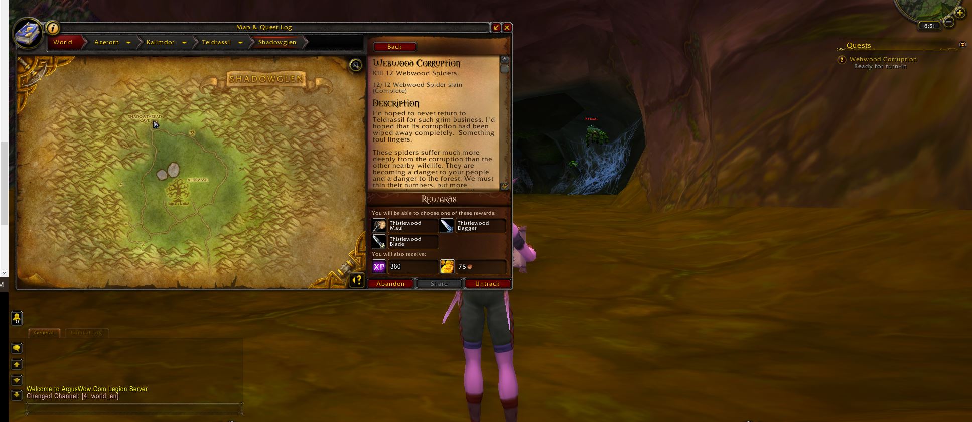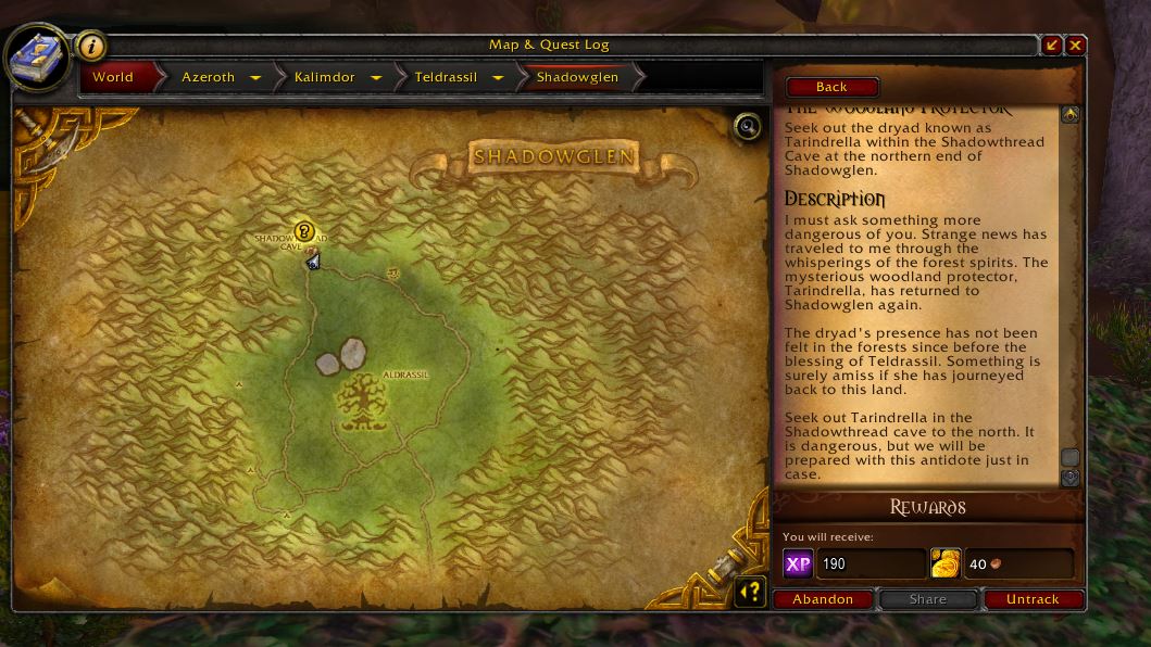 | Steps To Reproduce | Grab the quest from the night elf starting zone at Shadowglen from an npc name Dentaria Silverglade | ||||
