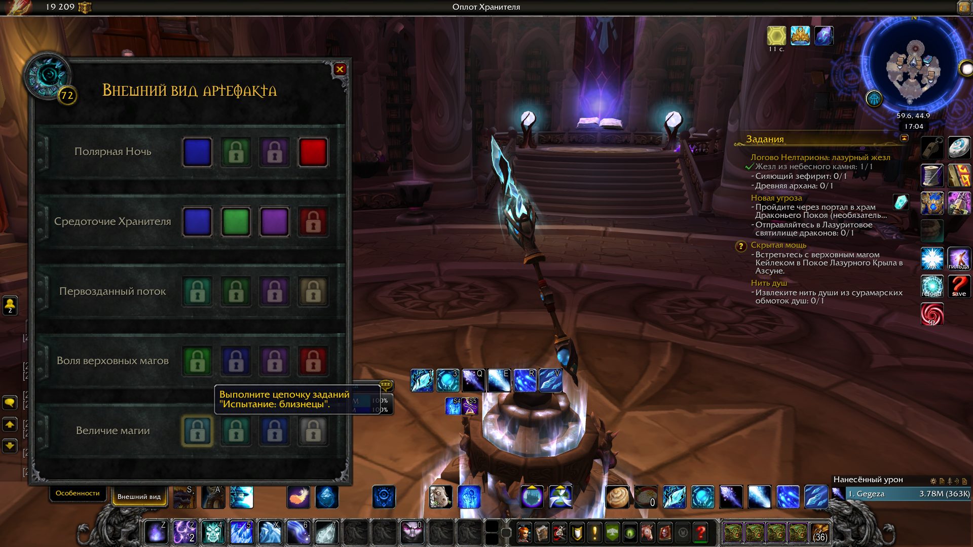 | Description | Маг GeGeza, Legion x100 Прошёл цепочку маговскую "Испытание: Близнецы". Последним квестом был "Дар шестерых" После прохождения должен открыться облик на артефакт, но облик закрыт | ||||