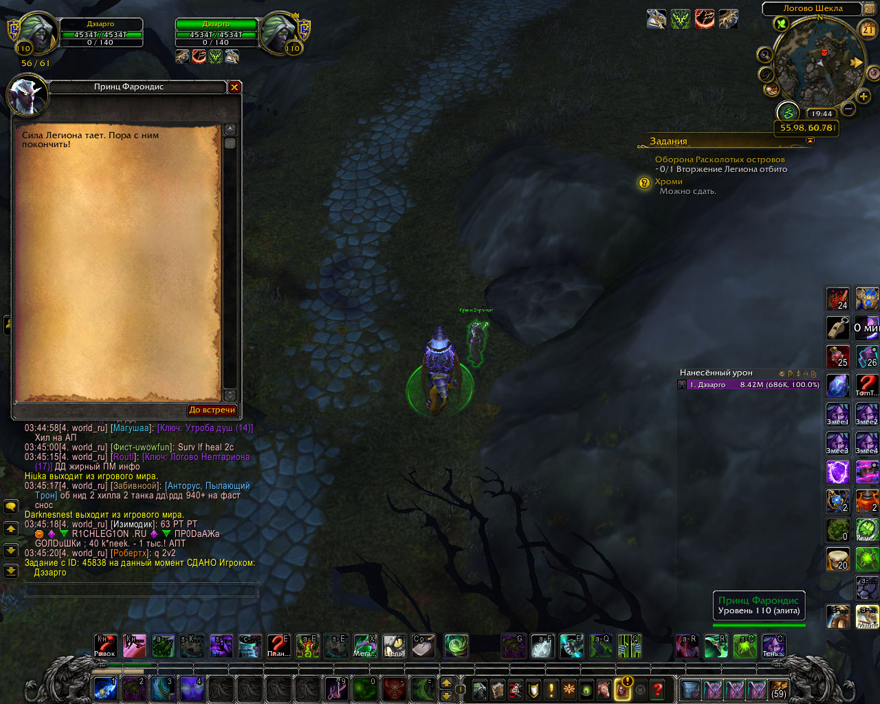 Привет. У Вас сдан первый квест второго этапа. Сдается он опять таки Фарондису, но НПС при этом перемещается еще дальше. От того места, где он раньше стоял - выше и правее. практически на правом гребне возвышенности. Точные координаты видны если открыть ссылку на квест. Там Фарондис выдаст квест - полетать на птичке, разбомбить кристалл на вершине башни, вокруг которой птичка сделает круг. После чего птичка везет на север локации, где еще одна копия Фарондиса принимает квест, выдает финальный третий квест и позволяет через свой диалог встать в очередь на выполнение финального сценария атаки (мини-инст на троих). Подобное построение имеют все атки Легиона. Не ленитесь самостоятельно извлекать с вовхеда минимум информации. |