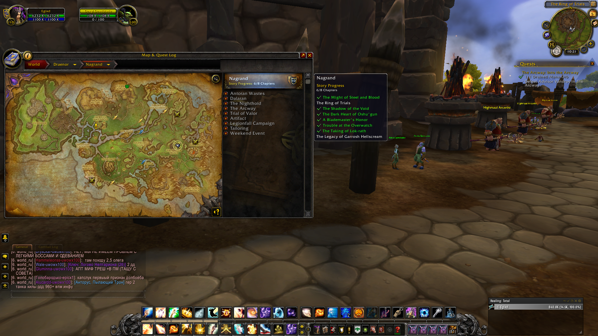 Hello. are you ready to fight? from wowhead - By Zephymetheus on 2015/05/02 (Patch 6.1.2) For me, Bread and Circuses became available (along with And Justice for Thrall) when I handed in Lok-rath is Secured. At that time, I had all parts of Nagrandeur already completed except for 'The Ring of Trials' and 'The Legacy of Garrosh Hellscream', but had not yet picked up any quest from Dexyl Deadblade. I wish all of you good luck in hunting this truly elusive quest. :) that is, start with the addon quest_completist for 7.3.5, in the addon window (opened by the chat command /qc ), see which quests are not completed according to the criteria with Garrosh, then, as the criteria is counted, take the quest from the NPC and go to the arena. https://www.wowhead.com/quest=35062/lok-rath-is-secured then https://www.wowhead.com/quest=35169/and-justice-for-thrall and https://www.wowhead.com/quest=35921/bread-and-circuses then https://www.wowhead.com/quest=34662/ring-of-trials-crushmaul |