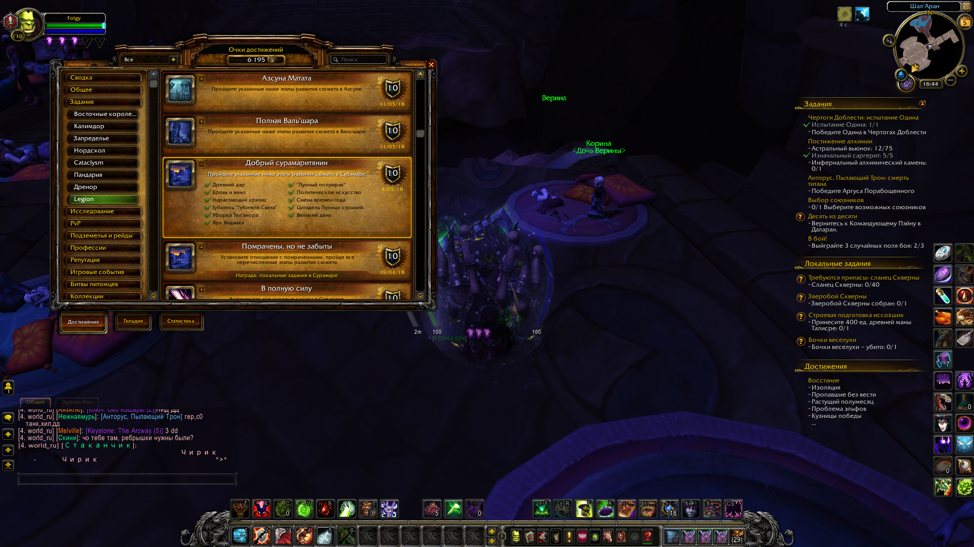 Привет. оно не так проверяется. Ставится аддон BtwQuests версии для 7.3.5 , в аддоне смотрятся квесты Сурамара по цепочкам, последовательно. Там на квестах , если требуются какие то критерии - они показываются, их состояние выполнено-не выполнено. С этого плясать. хотя вообще то странно, обычно проблемы бывают обратного толка - сурамаритянин выполнен на одном персонаже, на другом ачивки еще нету, а первый квест Восстания https://ru.wowhead.com/quest=45271/%D0%B2%D0%BE%D1%81%D1%81%D1%82%D0%B0%D0%BD%D0%B8%D0%B5 уже предлагается автоматически, стоит только войти в пещеру в Шаларане. https://ru.wowhead.com/quest=44955 вообще то последний квест цепочки первого критерия Восстания. так что если нет именно этого квеста - обязательно нужно смотреть и проверять все квесты цепочки - что то пропущено. |