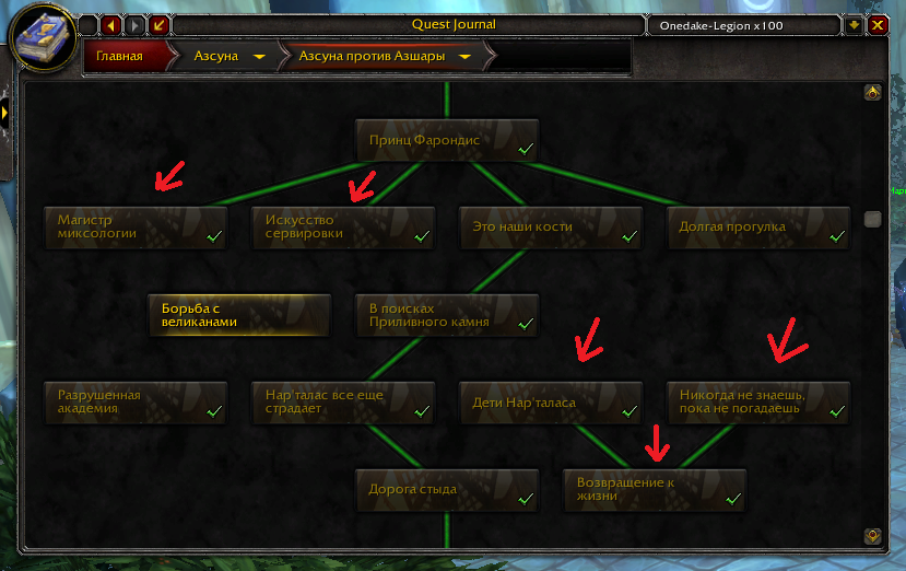 привет. глава "Борьба с великанами" начинается с квеста https://ru.wowhead.com/quest=38407/%D0%BD%D0%B0-%D0%B4%D0%BD%D0%B5-%D0%B1%D1%83%D1%82%D1%8B%D0%BB%D0%BA%D0%B8 , который можно получить , убивая мурлоков на северном берегу озера. Их там тьма, с каждого второго падает предмет, запускающий задание https://ru.wowhead.com/item=122699 и вот пока будете делать эту главу, в пещерах под островом, рядом с рабами, Вы найдете нпс https://ru.wowhead.com/npc=88863 Возьмете у него первый квест главы Макраны https://ru.wowhead.com/quest=38857/%D1%83%D1%81%D0%BB%D1%83%D0%B3%D0%B0-%D0%BC%D0%B8%D1%81%D1%82%D0%B5%D1%80%D1%83-%D1%88%D0%B5%D0%BA%D0%BB%D1%83 Квест может появиться не сразу, а после выполнения предыдущих квестов из других глав, просто запомните положение НПС, если он сразу не выдаст квест. примерно так. все квесты для чего то введены в игру, некоторые квесты являются критериями для достижений, но не всегда эти квесты бывают последними в цепочках. Иногда цепочка еще не закончилась, критерий для достижения дали, а цепочка продолжается для чего то еще. Аддон BtwQuests показывает зависимости доступа к цепочкам от предыдущих, но не всегда помогает понять где именно искать начальный квест. Тогда по названию квеста лучше сделать поиск на вовхеде. |