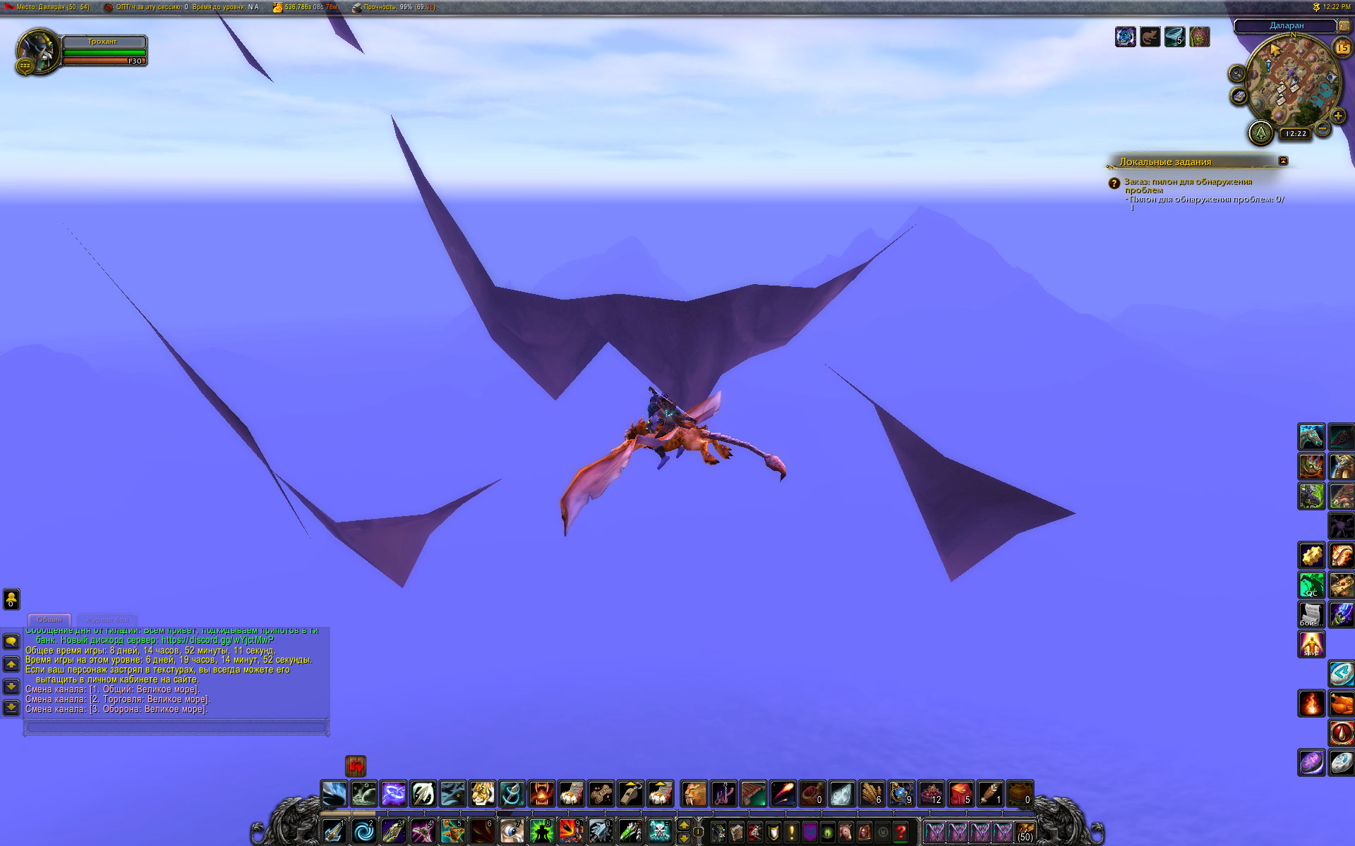 Вообще то мы имеем два бага. первый баг - некорректный призыв в инст в случае ппг (условно говоря, случайно собранная группа), если персонаж в момент принятия призыва летит на такси. второй баг - сбой системы восстановления координат персонажа при следующем входе в игру. Фигня с потерей координат, если персонаж прилетел в локацию на такси и после этого час летает по другим локациям на своем маунте, выполняя локалки, возвращается камнем в Даларан и затем выходит из игры. Чаще всего следующий вход в игру выбросит персонажа у полетки, куда он крайний раз прилетел. Это неправильно, но разработчики не желают исправить систему сохранения положения персонажа. Даже команда .save имеет косметический эффект и выполняется с целью самоуспокоения. На сохранение точки выхода из игры не влияет. на Расколотых островах. А в случае какого либо сбоя или дисконнекта эта система вообще сходит с ума и почему то вспоминает о таком вот состоянии, как показано на моих скриншотах. Причем, уверяю Вас, после исправления персонажа (а в этот момент персонаж был в Оргримаре) я дважды делал релог уже в Огри и дважды персонаж входил в игру на том же месте (у ворот Огри), затем я дважды делал релог в Пандарии - тоже все было нормально. а после вылета клиента снова система "вспомнила" что я летел в Награнд. И как Вы понимаете, прошло уже две недели после завершения Огненного солнцеворота, когда и случился первичный сбой, сервер минимум десяток раз делал плановый рестарт. |
