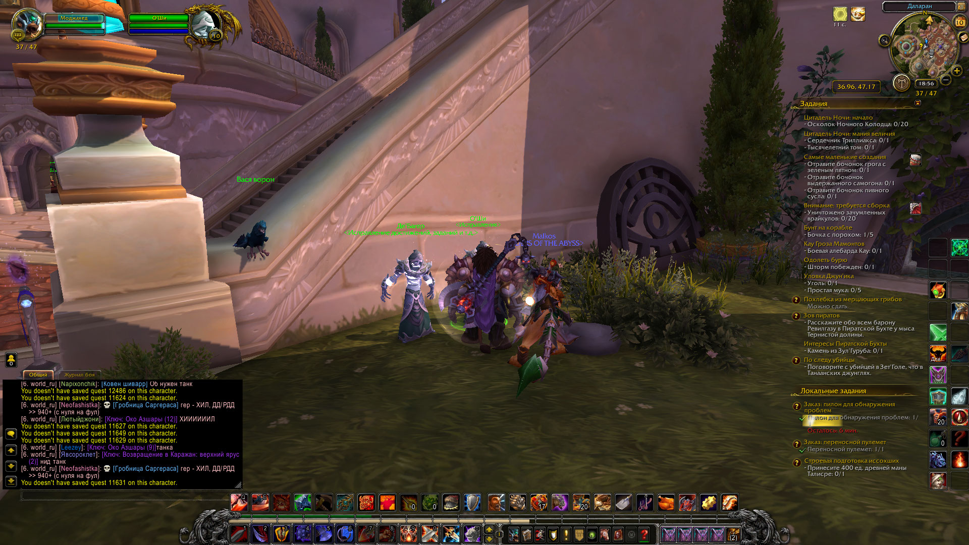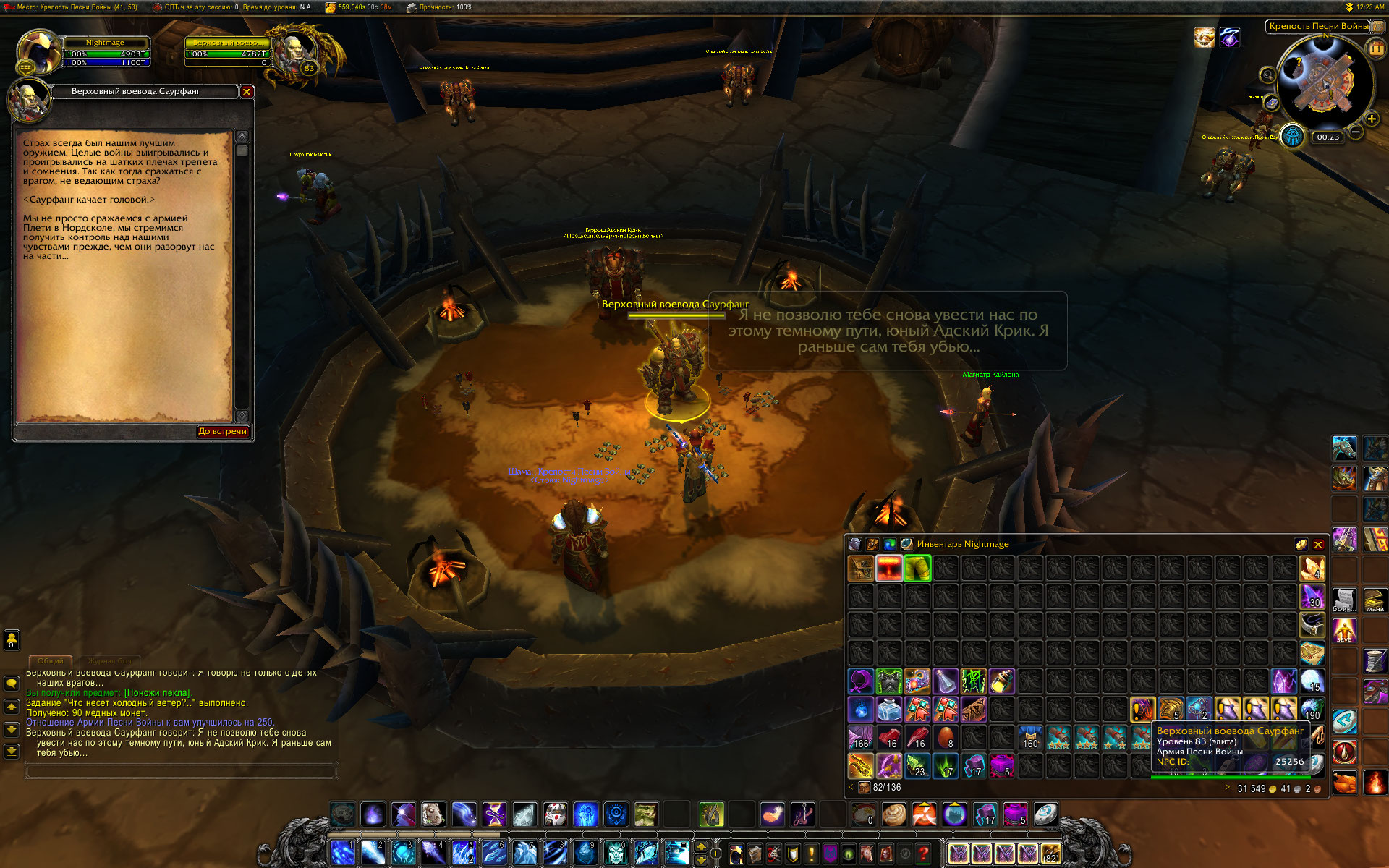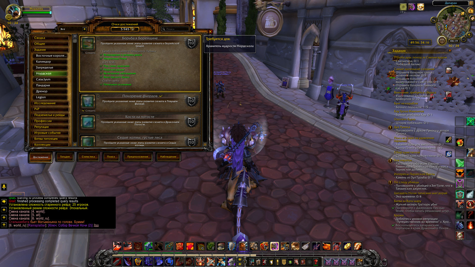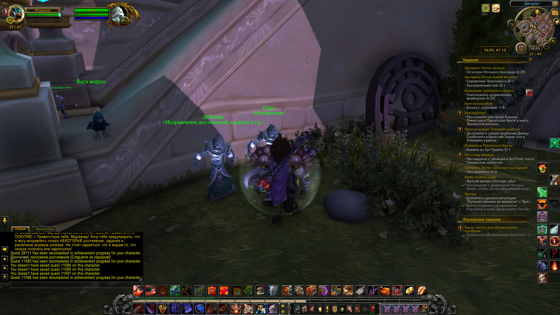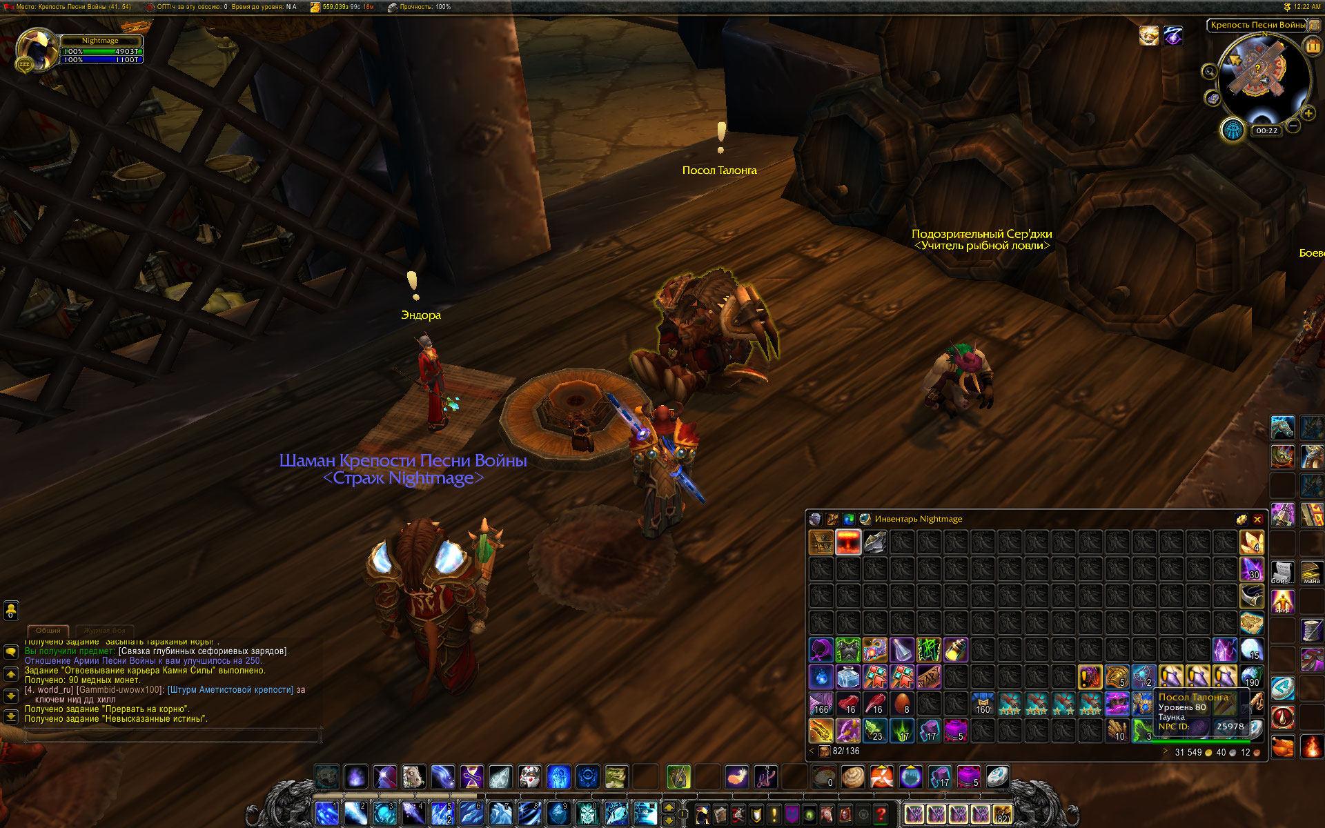 В общем, нашел я персонажа, на котором совершенно не сделана Борейка. Проверка показала, что После завершения квеста https://ru.wowhead.com/quest=11598 у НПС появились квесты https://ru.wowhead.com/quest=11574 и https://ru.wowhead.com/quest=11888 но у НПС https://ru.wowhead.com/npc=25272 не появился квест https://ru.wowhead.com/quest=12486 мой маг (ночнорожденный) шел начальной по цепочке 28711 , 11585 , 11596 - в таком порядке ему были выданы квесты. И только эти квесты. Были добиты все цепочки квестов вокруг крепости, это не устранило проблему. Так что считаю, что тестер имеет полное право перепроверить начальную цепочку квестов в Борейке. Что то с ней не так. С прошлого раза заметно, что несколько квестов были переработаны, в частности https://ru.wowhead.com/quest=11661/%D0%BE%D1%80%D0%B0%D0%B1%D1%83%D1%81-%D0%BA%D0%BE%D1%80%D0%BC%D1%87%D0%B8%D0%B9 и https://ru.wowhead.com/quest=11652/%D1%80%D0%B0%D0%B2%D0%BD%D0%B8%D0%BD%D1%8B-%D0%BD%D0%B0%D0%B7%D0%B0%D0%BC%D0%B0 WoWScrnShot_081121_032246.jpg (546,773 bytes) WoWScrnShot_081121_032207.jpg (532,595 bytes) |