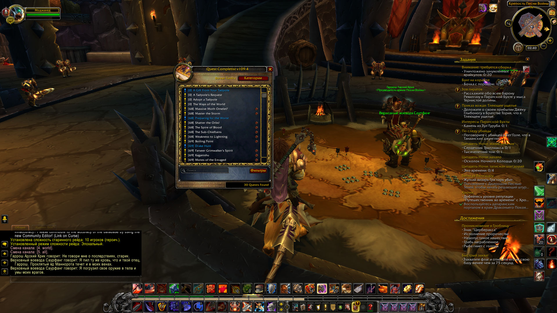 скрин проверки указанных мной квестов можно сделать? если все три квеста из возможных вариантов сделаны - можно перезачесть из у Оши последовательно, потом слетать еще раз в Крепость песни войны и глянуть у нпс новые квесты. еще вариант - поставить аддон Quest Completist Если после этого прилететь в локацию - он на карте нарисует квестодателей, при наведении на которых всплывают списки квестов с пометками - выполнены-не выполнены. Также с командной строки можно запустить табличный режим аддона - он списком выведет все квесты в локации, пролистав можно найти невыполненные и посмотреть их названия/ИД. И можно сделать скрины с окна аддона в качестве доказательств чего либо. |
