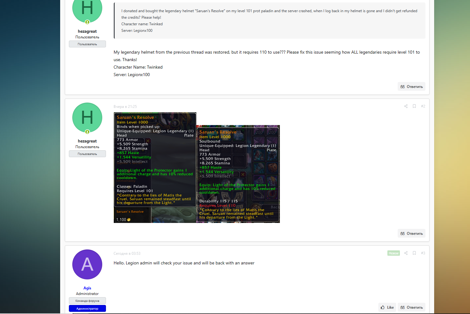 | Description | Over the past few days I have donated $50 and bought legendary and epic items from the donation vendor on my 101 twink. The first time I bought them the server crashed and I logged back in and the item's I bought were unequipped and in my bags and now required level 110 to equip, despite before the crash only requiring 101 to equip and I did equip them. I've made several tickets and such to resolve the issue and it was never resolved. So today I refunded the items, bought them again and equipped them. Then I logged out and back in and all 3 items require 110 to use again and the trinket just disappeared, can you please fix my item's so that I can continue playing and enjoying my 101 twink, thanks! Character Name; Twinked Server; Uwow Realm; Legionx100 | ||||