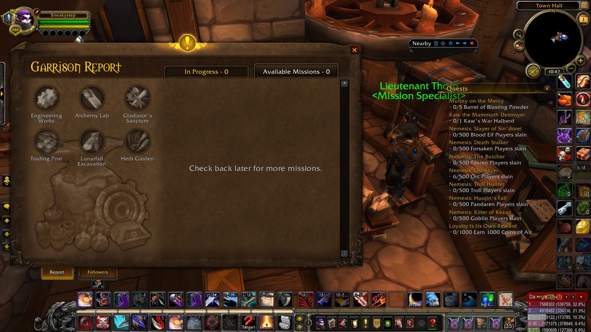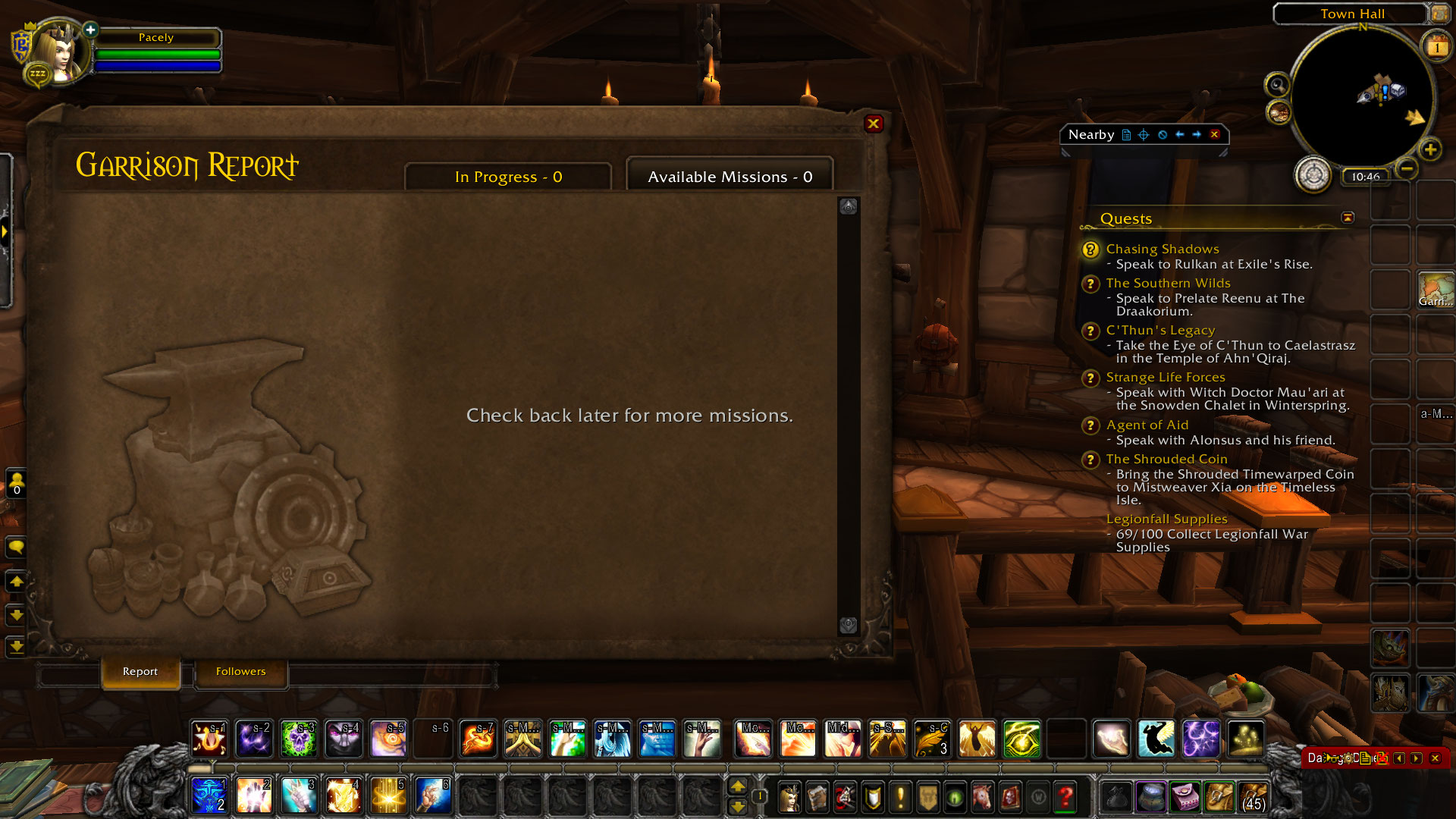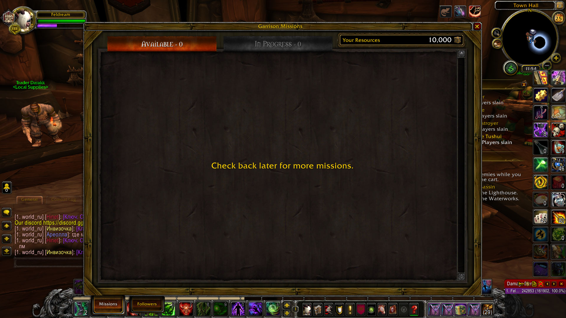| Description | No followers missions in the garrison report list, Sometimes not a single mission for are week or 2 weeks. As far as i understood the garrison should have more then 10 missions available each day even 26 missions. Sadly here you can be lucky to get 1 mission per week. https://www.wowhead.com/guides/garrisons/warlords-of-draenor-garrison-missions-guide I also cover all the conditions and requirements (16 x lvl100 - 675ilvl followers) to unlock all rare missions in the garrison but nothing happens... still 0 missions. | ||||