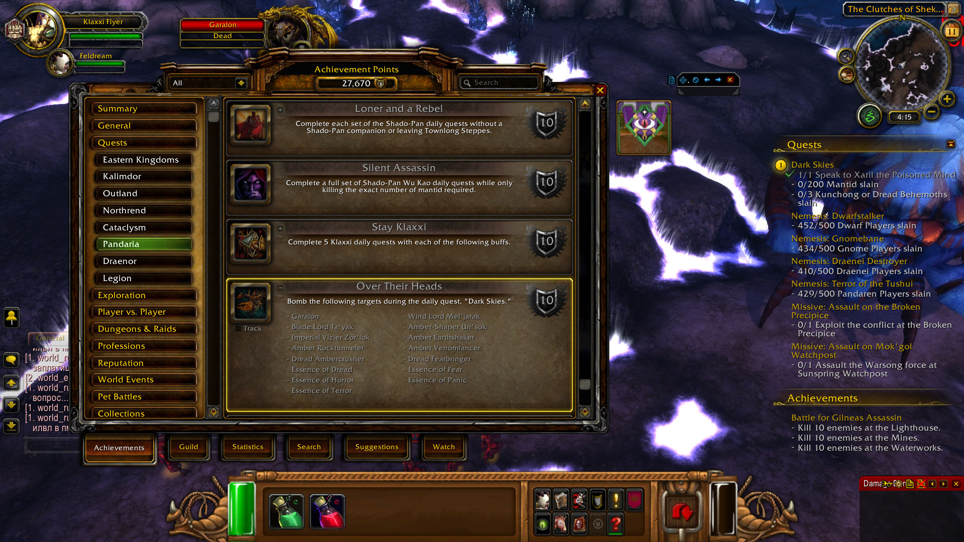 | Description | 1. https://www.wowhead.com/achievement=9481/you-have-been-rylakinated#comments Fixed on 2021-09-01 http://tracker.legionbugs.com/view.php?id=7119 (more then 2 months) There are no changes. There are still no action buttons to use. 2. https://www.wowhead.com/achievement=7316/over-their-heads#comments Fixed on 2021-10-09 http://tracker.legionbugs.com/view.php?id=15278 (more then 1 month) When bombed the mobs still don't count for the achievement. Fly path is still short and can't reach all mobs too. 3. https://www.wowhead.com/achievement=9610/history-of-violence#comments Fixed on 2021-11-04 http://tracker.legionbugs.com/view.php?id=16435 (a week ago) https://www.wowhead.com/npc=88064/jewel-of-transformation still doesn't work and thus https://www.wowhead.com/npc=88068/boulder-pile#comments still can't be broken to find the 3 hidden items. 4. https://www.wowhead.com/achievement=9548/buried-treasures#comments Fixed on 2021-11-04 http://tracker.legionbugs.com/view.php?id=16434 (a week ago) https://www.wowhead.com/npc=87530/dirt-mound still can't be dig thus can't find https://www.wowhead.com/npc=87527/wolf-pup-remains and https://www.wowhead.com/npc=87525/warsong-remains. The item https://www.wowhead.com/npc=87524/warsong-relics can't be found anywhere in the camp Are the fix updates forgotten ? or are "fake" fixes ? | ||||