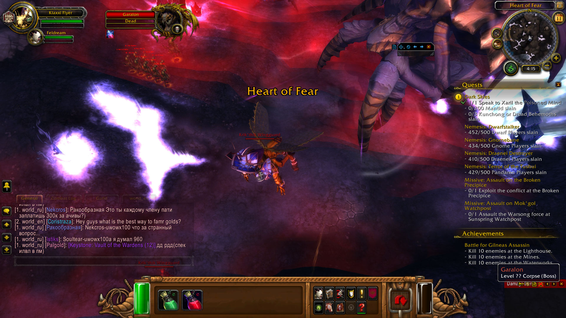 So about point 2.) the fly path is short alright. I can tell you right now that even if the mobs counted for the achievement you will NOT finish it. If all the mobs are spawn at the correct coordinates then with this fly path we have right now it will never reach them. As far as i see it only the 5-6 mobs spawning in front of the Heart of Fear raid can be bombed. The rest 10 mobs are far on the scar path. The original fly path covers all the scar 100% and here the fly path is only 25% or even less of the original. Well another way to fix it is to spawn all the mobs in front the raid entrance as the first 5. |