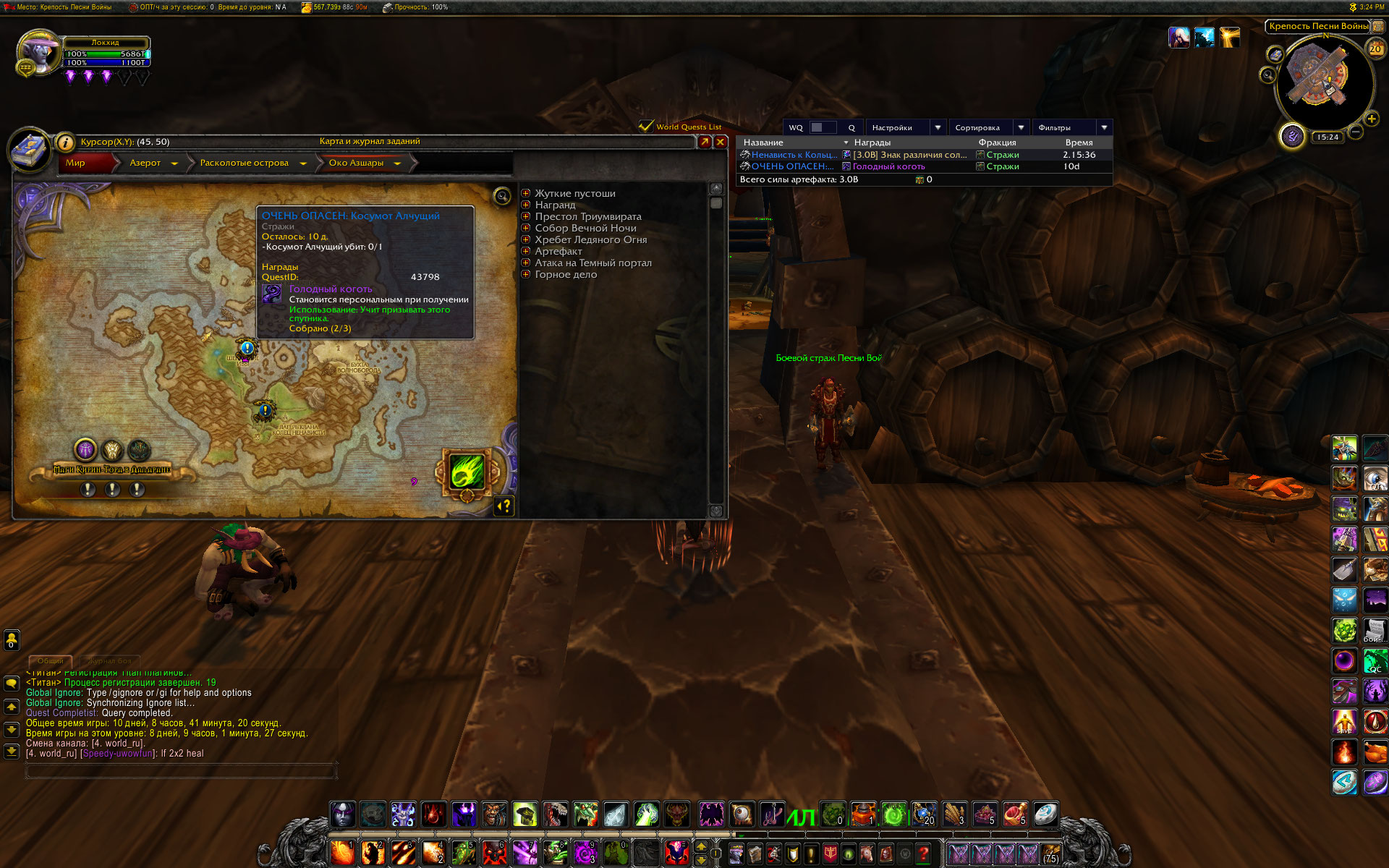18 скорее всего локалка на Косумота была активна, так как на сегодня осталось 10 дней. И стоит обратить внимание на первый вариант, предложенный Alica228. так как есть вопрос к Alica228 - в локации Око Азшары постоянно активны от трех до семи элитных локальных заданий, которые не отображаются в полном списке аддона и на карте. Но по прилету в локацию все они автоматически принимаются. Это бонусные локалки стражей или просто аддон , которым я пользуюсь устаревший? WoWScrnShot_112021_173251.jpg (573,796 bytes) WoWScrnShot_112021_172933.jpg (449,100 bytes) WoWScrnShot_112021_172438.jpg (519,995 bytes) |
