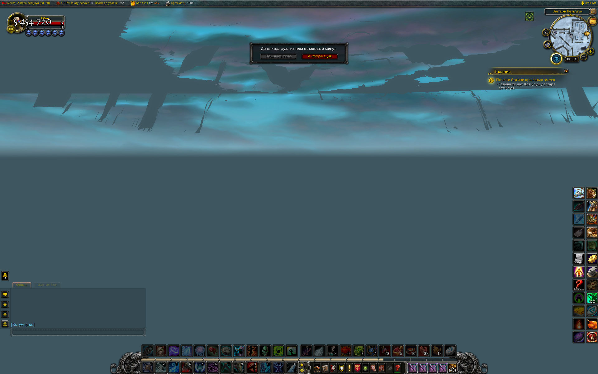 Желаете ответный пример "неузнаваемости"? Легко. https://ru.wowhead.com/quest=12655/%D0%B1%D0%BB%D0%B0%D0%B3%D0%BE%D1%81%D0%BB%D0%BE%D0%B2%D0%B5%D0%BD%D0%B8%D0%B5-%D0%B7%D0%B8%D0%BC%D1%80%D1%83%D0%BA%D0%B0 - как обычно собрать 10 итемов, получить баф. Если персонаж 110 уровня, персонаж летает в ЗулДраке и персонаж, находясь в полете попытается потыкать в статую https://ru.wowhead.com/object=190657 , то его выкинет в произвольную точку мира, хорошо если над водой (можно успеть использовать камень до наступления полной усталости). Координаты меняются произвольно, все три. Может забросить в небо или под текстуры (по вертикали), по горизонтали скорее всего какие то привязки есть, так как даже далеко в море за гранью жизни, наблюдалась изнанка строений или инстанса. Если не взаимодействовать, а просто влететь в статую лбом - то меняется ощущение мира, текстуры становятся проницаемыми, скорость перемещения возрастает раз в пять. Все это на маунте, так что можно летать сквозь все. Но мир не хочет взаимодействовать, а если слезть с маунта - мгновенная смерть от падения. WoWScrnShot_120321_105853.jpg (625,218 bytes) WoWScrnShot_120321_105026.jpg (531,722 bytes) |