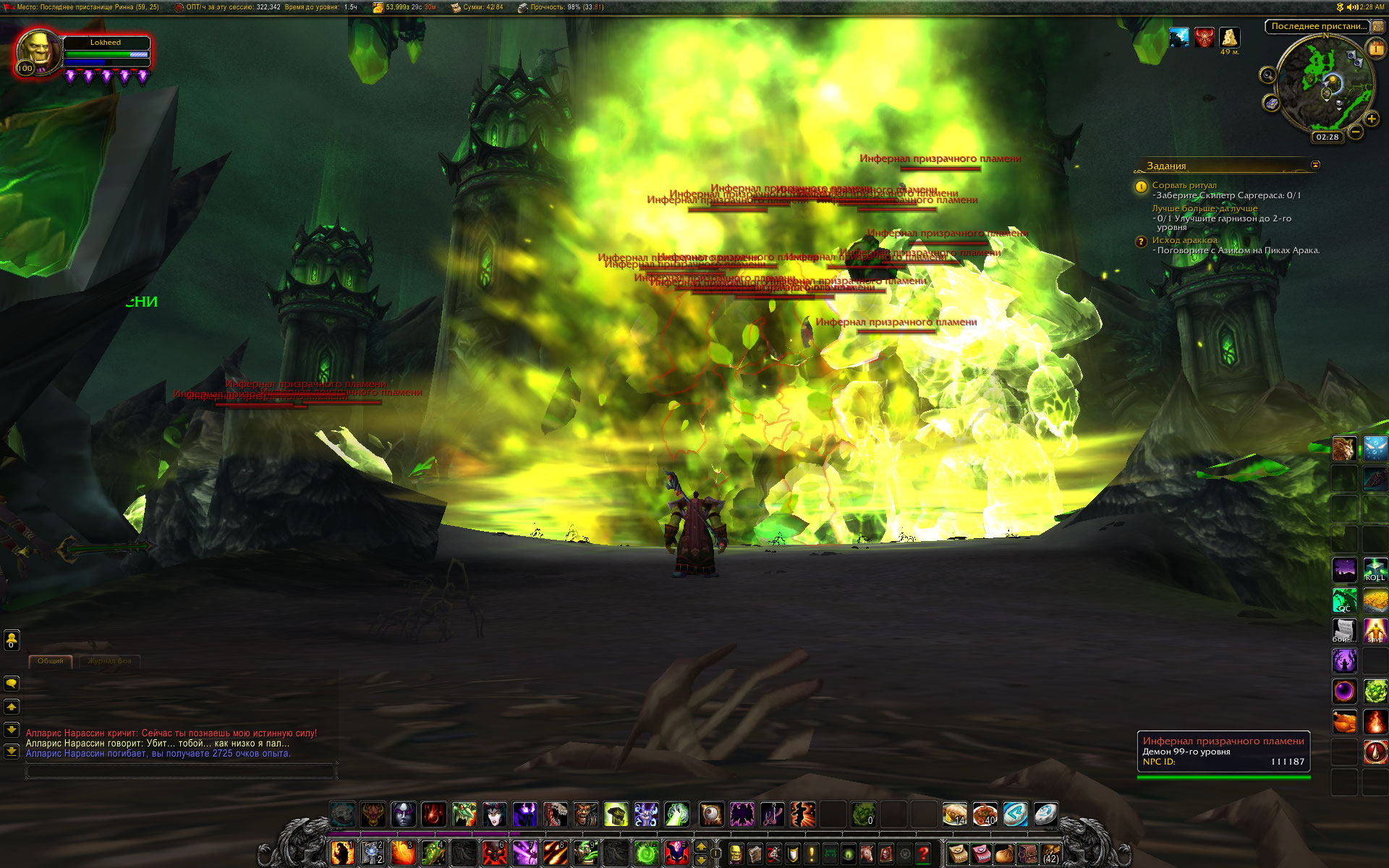 | Description | В квесте https://ru.wowhead.com/quest=43254/%D1%81%D0%BE%D1%80%D0%B2%D0%B0%D1%82%D1%8C-%D1%80%D0%B8%D1%82%D1%83%D0%B0%D0%BB варлок должен прилететь на расколотый берег к Гробнице Саргераса, постоять там, потом убить моба, забрать артефакт и вернуться в Даларан. Не повезло раз - гоблин. Нетопырь привозит на Расколотый берег и сгружает под текстуры. Смерть от падения. Не повезло два - 99 уровень. https://ru.wowhead.com/npc=110556/%D0%B0%D0%BB%D0%BB%D0%B0%D1%80%D0%B8%D1%81-%D0%BD%D0%B0%D1%80%D0%B0%D1%81%D1%81%D0%B8%D0%BD , становится враждебным и по КД (каждые десять секунд, призывает https://ru.wowhead.com/spell=221323/%D0%BF%D1%80%D0%B8%D0%B7%D1%8B%D0%B2-%D0%B8%D0%BD%D1%84%D0%B5%D1%80%D0%BD%D0%B0%D0%BB%D0%B0-%D0%BF%D1%80%D0%B8%D0%B7%D1%80%D0%B0%D1%87%D0%BD%D0%BE%D0%B3%D0%BE-%D0%BF%D0%BB%D0%B0%D0%BC%D0%B5%D0%BD%D0%B8 , заполняя остальное время между призывами кастами спеллов https://ru.wowhead.com/spell=221309/%D0%BF%D0%BE%D1%85%D0%B8%D1%89%D0%B5%D0%BD%D0%B8%D0%B5-%D0%B6%D0%B8%D0%B7%D0%BD%D0%B8 и https://ru.wowhead.com/spell=79932/%D1%81%D1%82%D1%80%D0%B5%D0%BB%D0%B0-%D1%82%D1%8C%D0%BC%D1%8B . Инфернал , если его атаковать, пинается, отбрасывая персонажа метров на 80, с одного пинка отправляет за пределы зоны боя. Естественно, добежать и продолжить убивание Аллариса проблематично, он выходит из боя раньше и снова унего полное ХП, только инфернал вернулся и встал рядом. В общем, если долго пинать Аллариса, то за это время он успевает накастовать пару десятков инферналов, которые группой стоят вокруг постамента с артефактом. И забрать арт оказывается также нетривиальной задачей. Все получилось конечно, процесс занял около часа времени. Просто интересно, так и должно быть в плане количества призываемых инферналов? | ||||