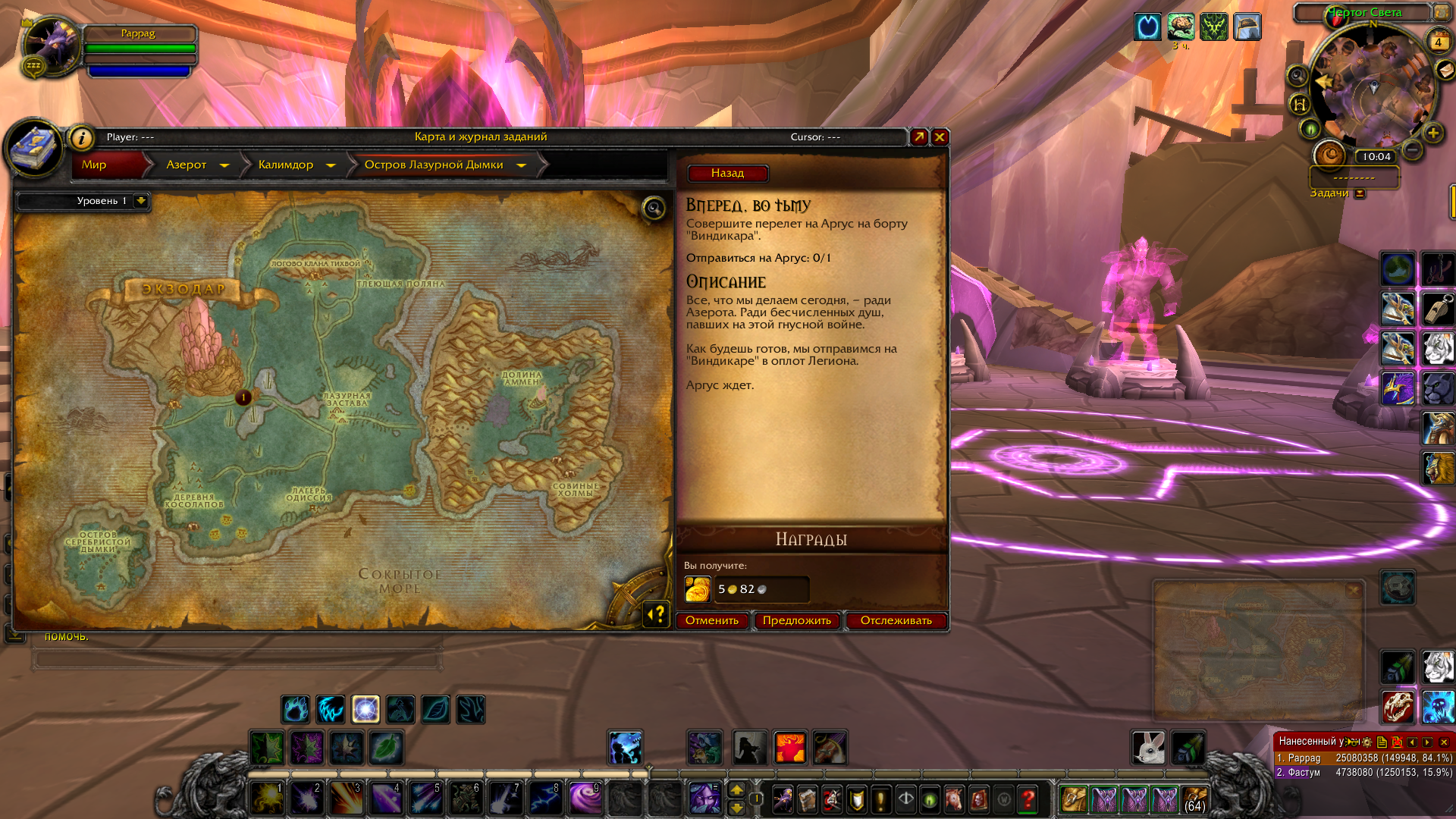 До завершения квеста Вперед во тьму портал на Аргус еще не доступен, он открывается если сдать этот квест на правильном Виндикаре над Крокууном. Вы смотрели портал в квестовом Экзодаре или добирались в город обычным порядком? Чтобы попасть в квестовый нужно подойти в порт столицы, к НПС на корабле, которые в начале цепочки отправляли в Экзодар и нажать диалог у главной неписи. БУквально три дня назад я новым чаром начал цепочку Аргуса, Только я полностью сделал цепочку и взяв квест Один в Бездне, уже на правильном Виндикаре над Крокууном, улучшил в тигеле артефакт. А через два дня вернулся порталом из Даларана и выполнил первую часть сюжетки. |