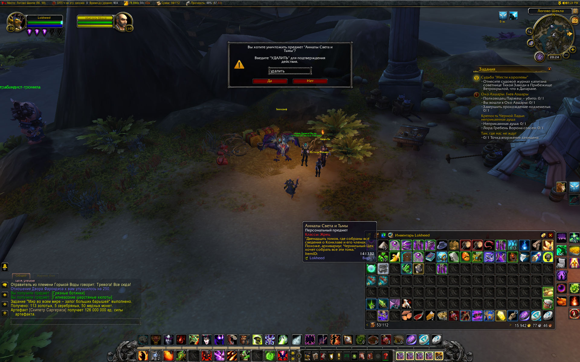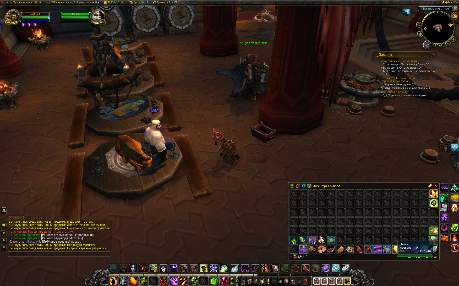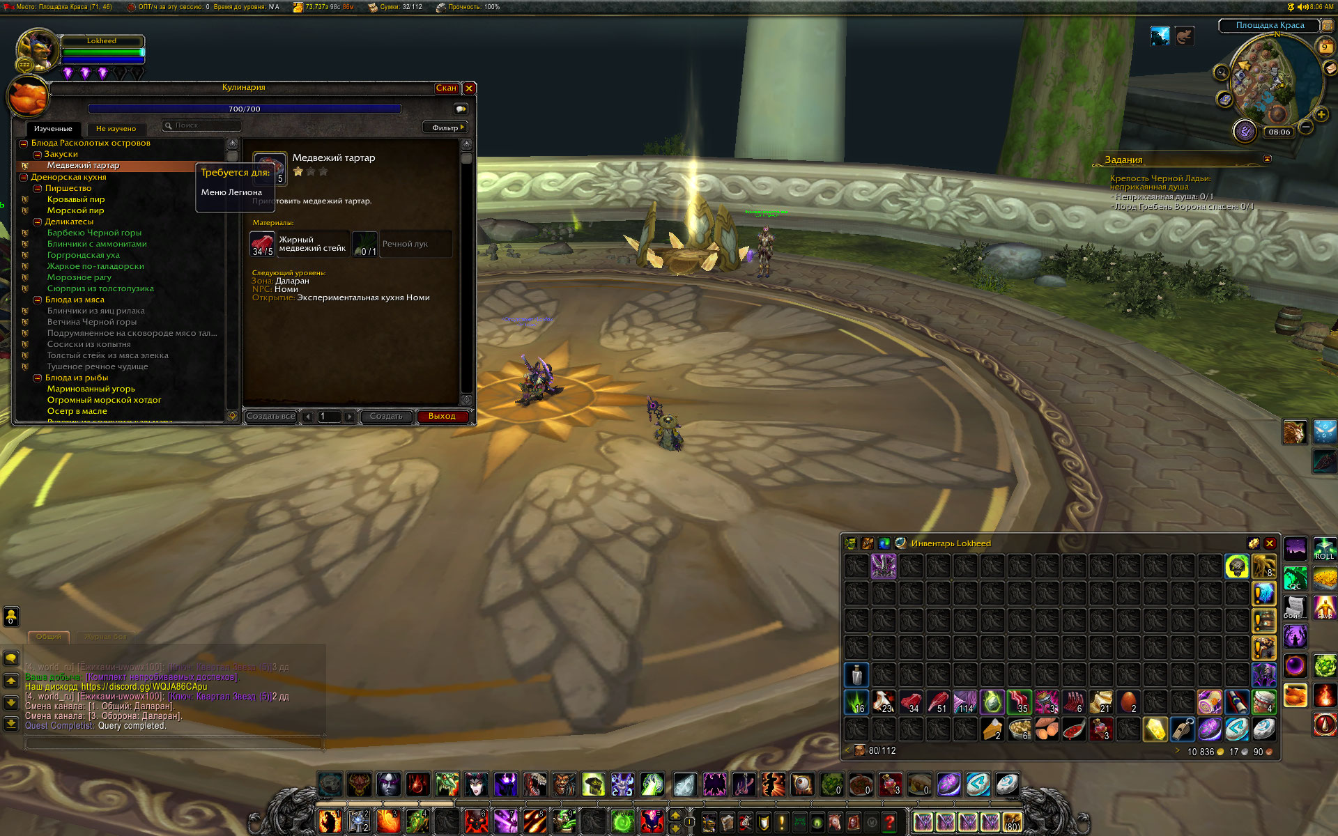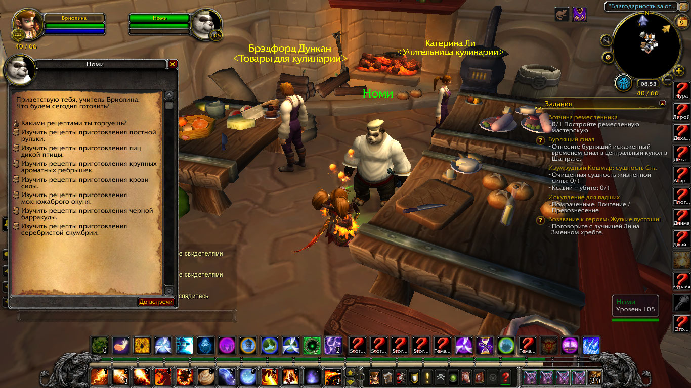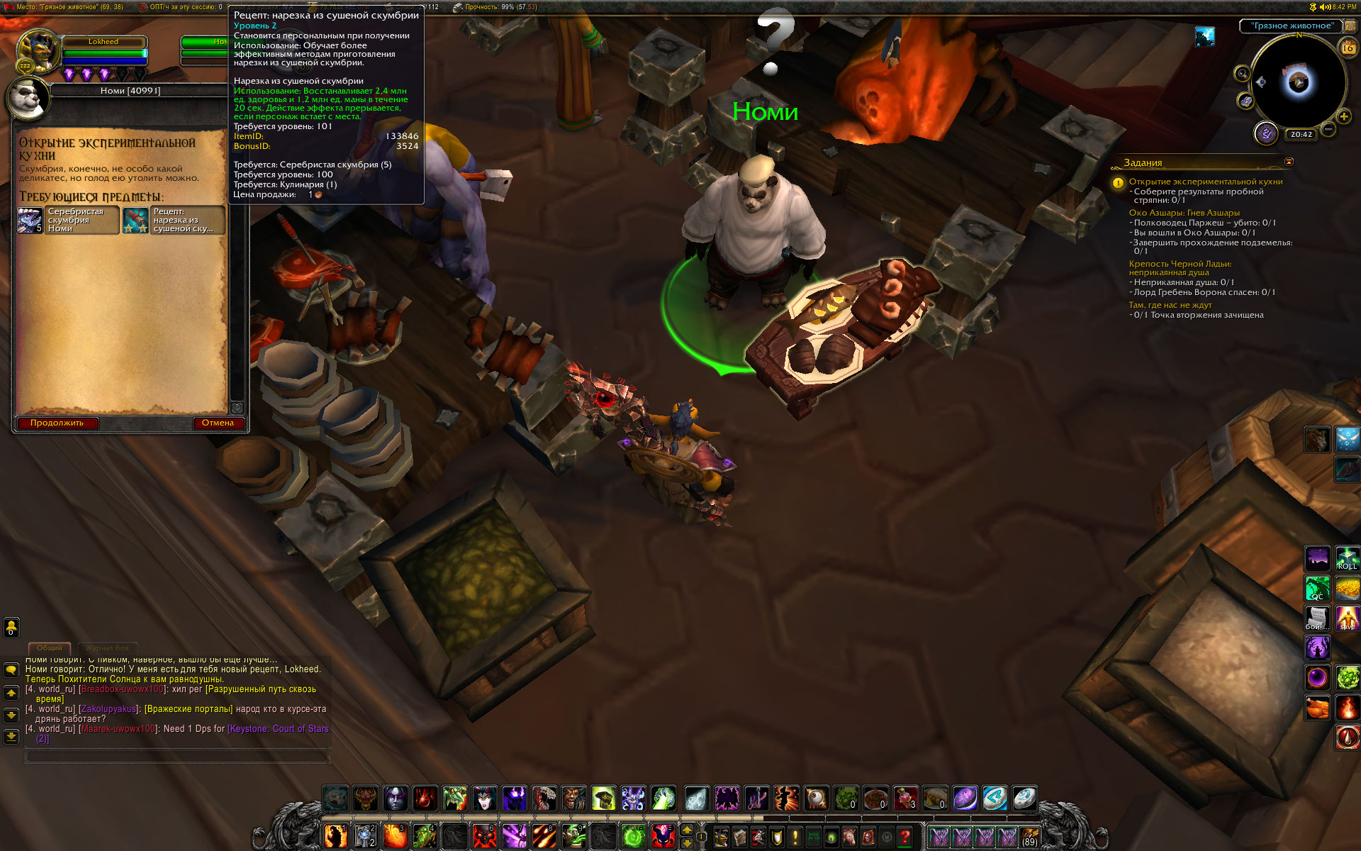 Добыты еще два рецепта в Азсуне. На месте получения рецептов Номи не появился. По прибытии в Даларан Номи не появился. Побегал по Даларану - таверна, банк, оплот варлока, площадка Краса - Номи не появился. Сделал релог, из оплота выбросило к полетке. Но зато появился Номи и выдал первый квест цепочки. В общем, Номи бегал за мной по Даларану и после завершения цепочки квестов на кулинарию и после активации заказа у Номи на исследование. Исчез только после еще одного релога. надеюсь навсегда. Скрины прилагаю. p.s. Опять заметил старый баг. https://ru.wowhead.com/quest=40991/%D0%BE%D1%82%D0%BA%D1%80%D1%8B%D1%82%D0%B8%D0%B5-%D1%8D%D0%BA%D1%81%D0%BF%D0%B5%D1%80%D0%B8%D0%BC%D0%B5%D0%BD%D1%82%D0%B0%D0%BB%D1%8C%D0%BD%D0%BE%D0%B9-%D0%BA%D1%83%D1%85%D0%BD%D0%B8#comments у нас в описании квеста указана награда https://ru.wowhead.com/item=133846/%D1%80%D0%B5%D1%86%D0%B5%D0%BF%D1%82-%D0%BD%D0%B0%D1%80%D0%B5%D0%B7%D0%BA%D0%B0-%D0%B8%D0%B7-%D1%81%D1%83%D1%88%D0%B5%D0%BD%D0%BE%D0%B9-%D1%81%D0%BA%D1%83%D0%BC%D0%B1%D1%80%D0%B8%D0%B8 , а после выполнения начальных критериев появляется еще один в сумке должен быть тот же https://ru.wowhead.com/item=133846/%D1%80%D0%B5%D1%86%D0%B5%D0%BF%D1%82-%D0%BD%D0%B0%D1%80%D0%B5%D0%B7%D0%BA%D0%B0-%D0%B8%D0%B7-%D1%81%D1%83%D1%88%D0%B5%D0%BD%D0%BE%D0%B9-%D1%81%D0%BA%D1%83%D0%BC%D0%B1%D1%80%D0%B8%D0%B8 . Тогда как в описании квеста на вовхеде ни о чем таком не упоминается. И без того, чтобы купить у Номи рецепт на 2 звезды https://ru.wowhead.com/item=133846/%D1%80%D0%B5%D1%86%D0%B5%D0%BF%D1%82-%D0%BD%D0%B0%D1%80%D0%B5%D0%B7%D0%BA%D0%B0-%D0%B8%D0%B7-%D1%81%D1%83%D1%88%D0%B5%D0%BD%D0%BE%D0%B9-%D1%81%D0%BA%D1%83%D0%BC%D0%B1%D1%80%D0%B8%D0%B8 , невозможно забрать пробную стряпню, и соответственно, сдать квест. |