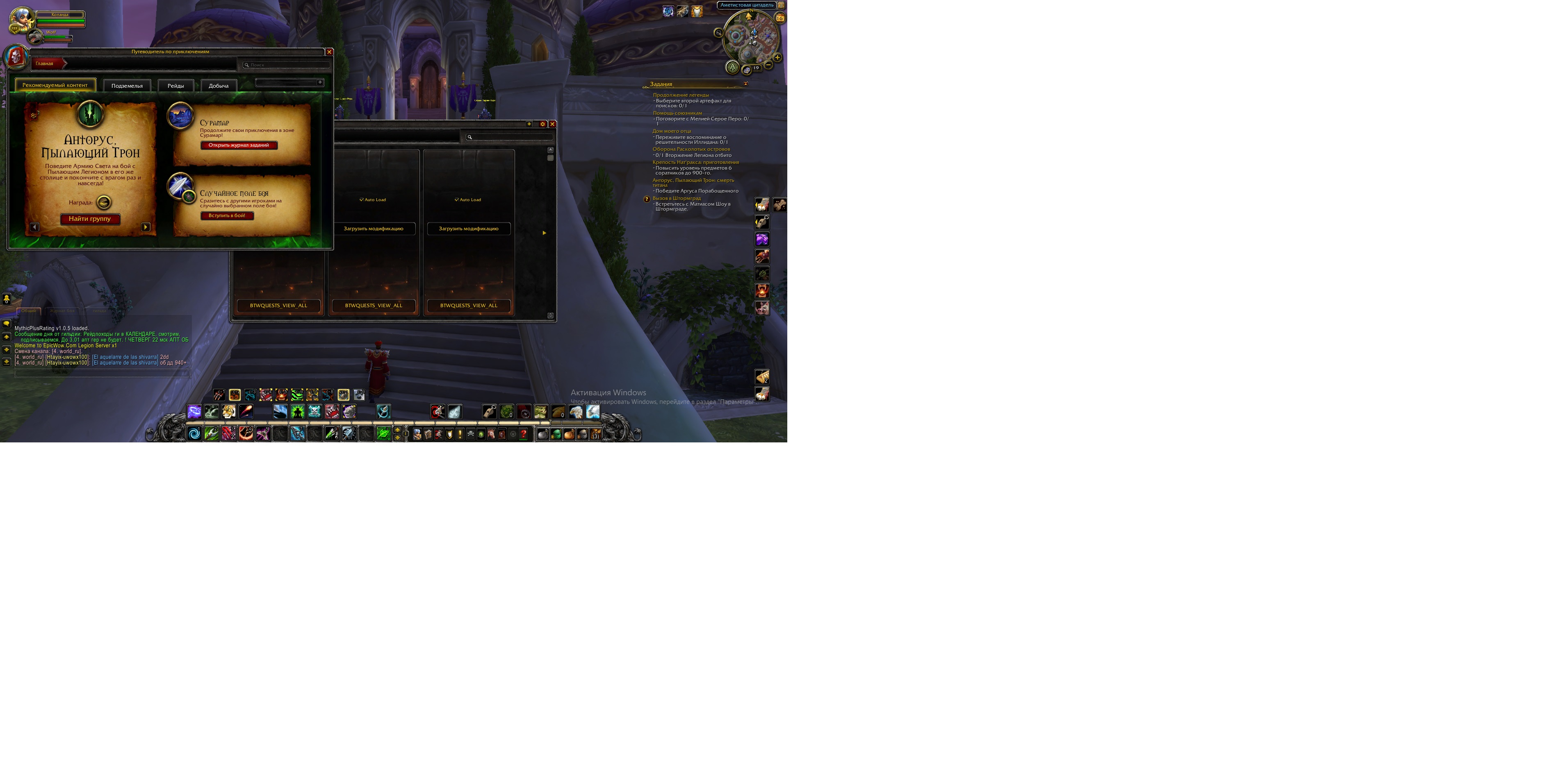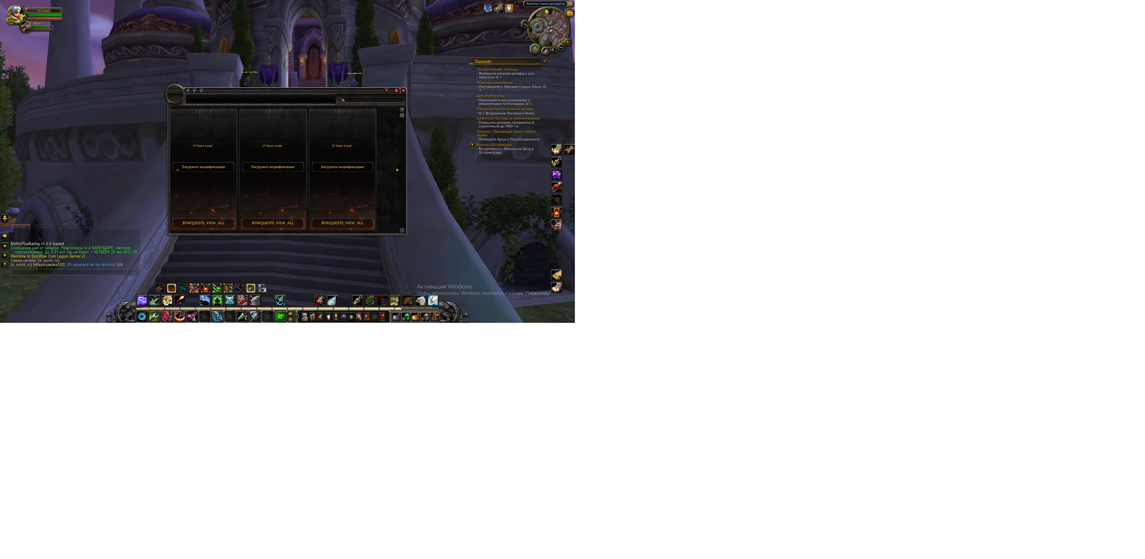 Здравствуйте! Цепочка начинается с квестов https://ru.wowhead.com/quest=39985 / https://ru.wowhead.com/quest=44555 . https://ru.wowhead.com/quest=39985 вы сможете получить в Даларане при достижении 110-ого уровня. По скрину сложно определить ваш уровень, а так же состояние оплота класса, поэтому требуется ответ от вас. Аддон BtwQuests не работает, потому что вы скачали версию для клиента 8.0.1 и выше, а мы играем на версии 7.3.5 |