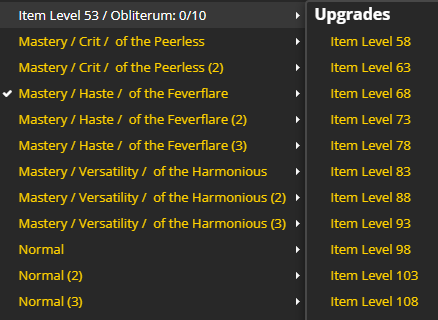 Smogy GTFO NAB - https://www.wowhead.com/guide=7.0.3-launch Crafted Gear: The best crafted gear starts at ilvl 815 after completing a long questline. This can be upgraded to 850 via the Obliterum Forge and Obliterum, which is created by incinerating old crafted gear. |