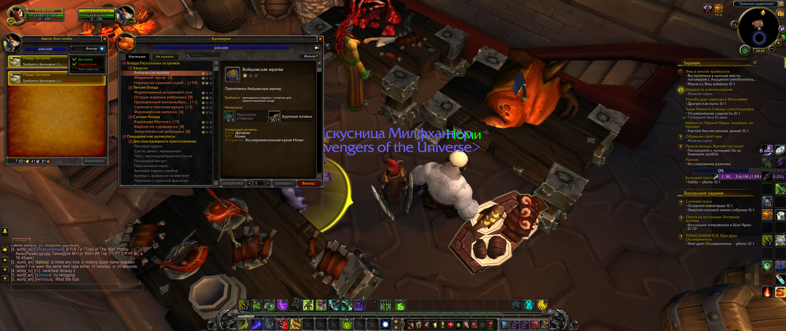 | Description | Если не смотреть на проблему с появлением Номи в целом - ее вроде как решают, остается один немаловажный вопрос - Изучение кулинарии крайне сломано. В данном конкретном примере расскажу о своем пути - Взял кулинарку, качал-рыбачил-качал, достиг 600 (уровень пандарии), однако изучить дренорскую кухню или легионовскую(которая должна быть по идее с 1-го уровня доступна - невозможно. Должен заметить, что легионовские рецепты робят, кухню с Номи с горем и танцами - но тоже работает. | ||||