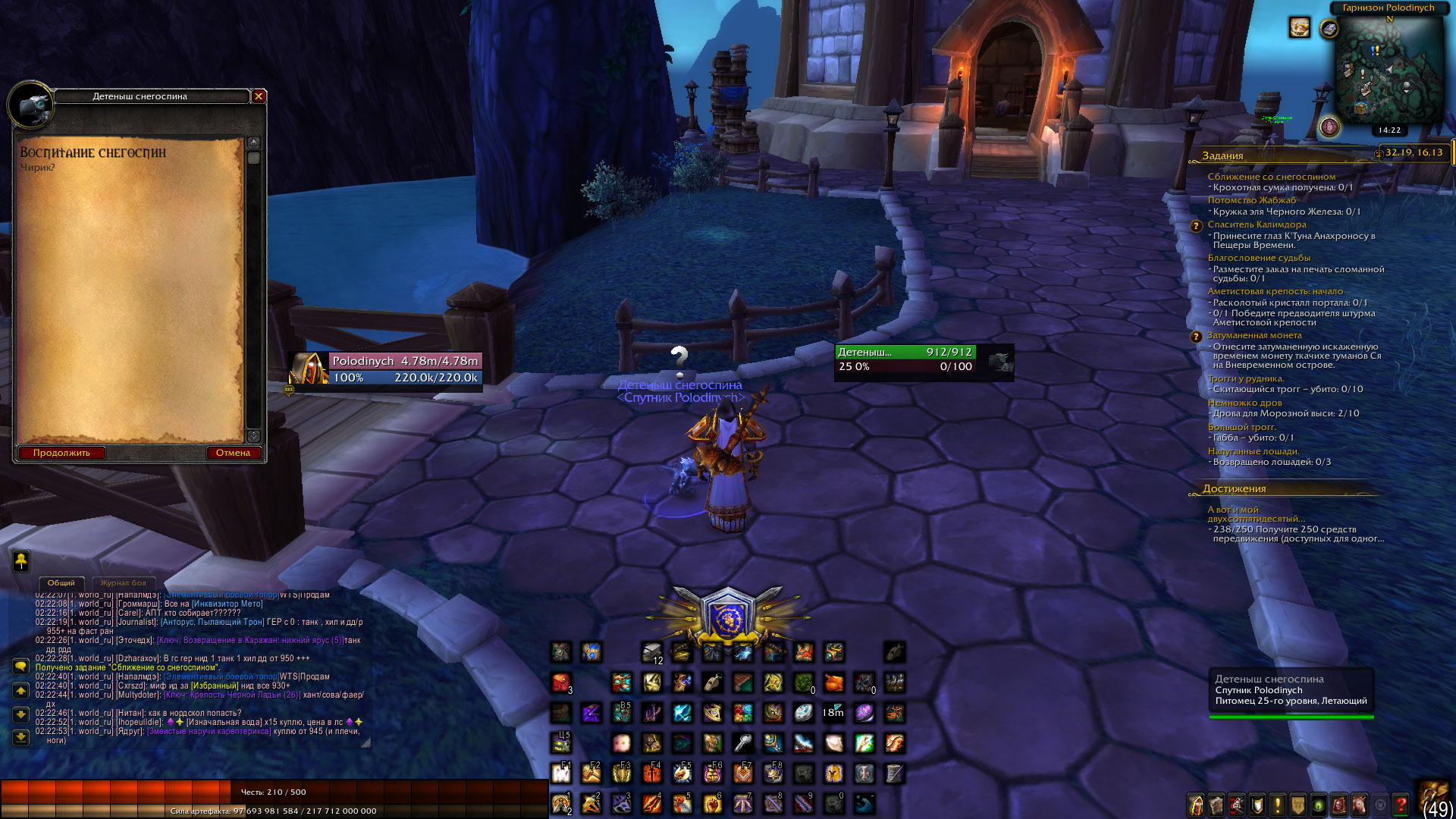 | Description | Невозможно сдать квест Воспитание Снегоспин, в связи с чем нельзя продолжить цепочку квестов на получения маунта | ||||