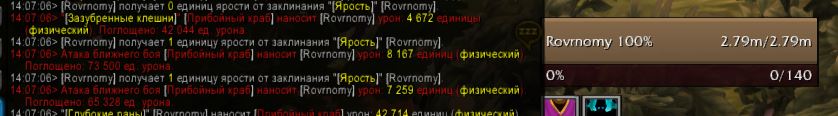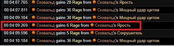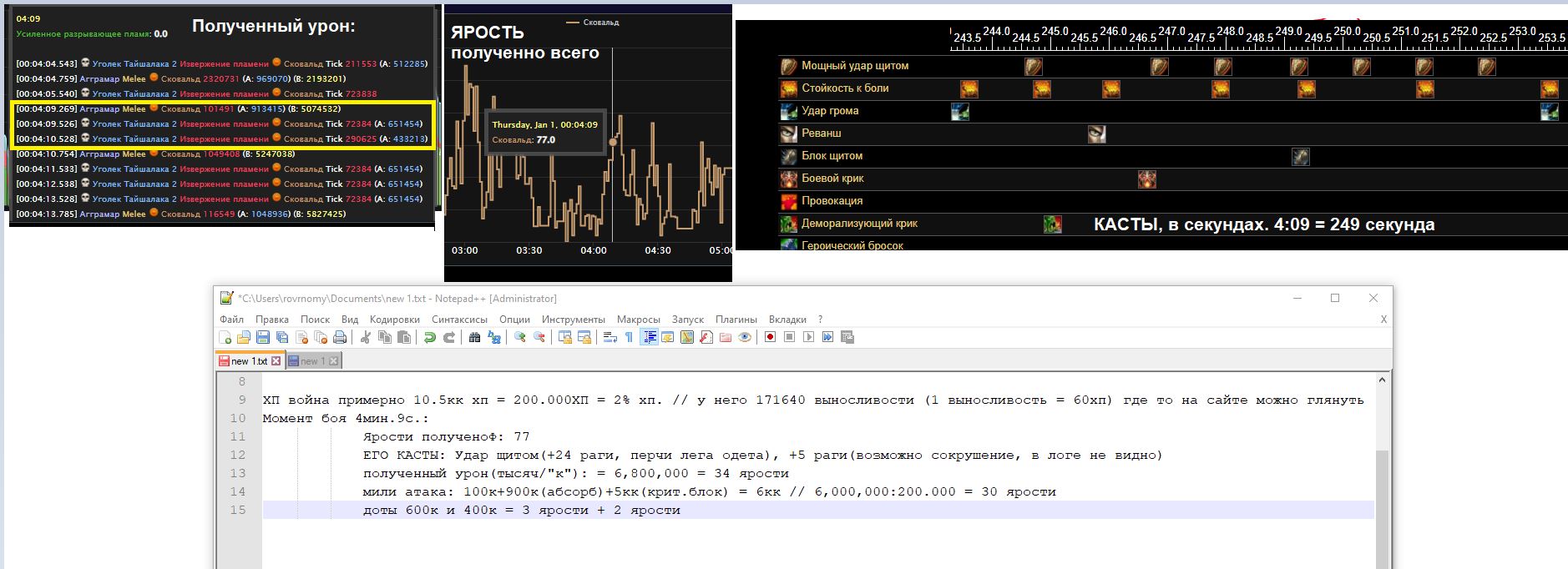 видимо был не прав насчёт блока, исходя из расчётов ниже.. признаю. получилось вроде выделить участок в логе и посчитать и короче вот: ХП война примерно 10.5кк хп = 200.000ХП = 2% хп. // у него 171640 выносливости (1 выносливость = 60хп) где то на сайте можно глянуть в логе его статы. Момент боя 4мин.9с.: Ярости полученоФ: 77 ЕГО КАСТЫ: Удар щитом(+24 раги, перчи лега одета), +5 раги(возможно сокрушение, в логе не видно) полученный урон(тысяч/"к"): = 6,800,000 = 34 ярости мили атака: 100к+900к(абсорб)+5кк(крит.блок) = 6кк // 6,000,000:200.000 = 30 ярости доты 600к и 400к = 3 ярости + 2 ярости |