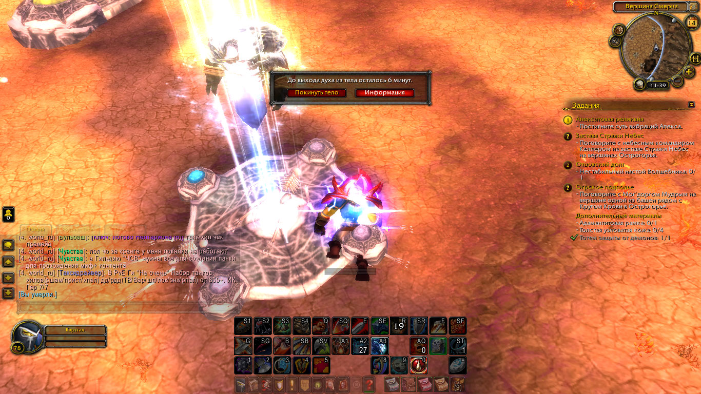 | Description | Квест можно взять у Чу'а'лора, в Огри'ле, в Острогорье, Запределье После активации кристалла с названием "Апекситовая реликвия" игрок должен выбрать все цветные камни в последовательности указаной кристаллом, но т.к квест забаган - игрок не может прожимать камни и спустя несколько секунд персонаж игрока умирает от "Кара Апекситового кристалла" | ||||