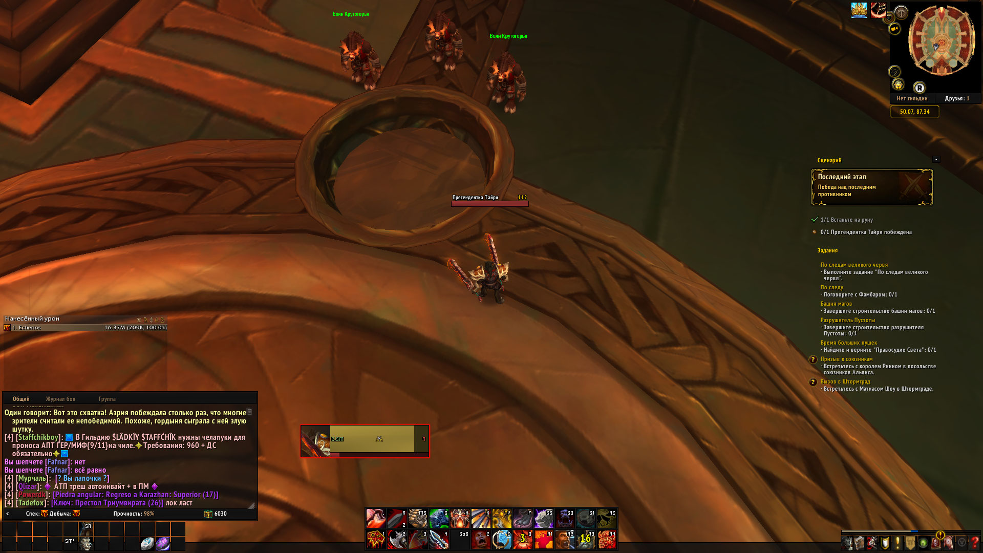 | Description | Баг в сценарии на получение классового маунта у воина. Кратко о сценарии: Нужно победить 3 бойцов по очереди, после победы над третьим нужно встать на особую зону "руну" у после этого появится последний боец - Претендентка Тайри. И вот в этом ошибка. Она моментально убегает под текстуры ( под пол ). И сидит там, как-либо достать её, спровоцировать, или задеть аое способностью не удается. Просьба помочь!! | ||||