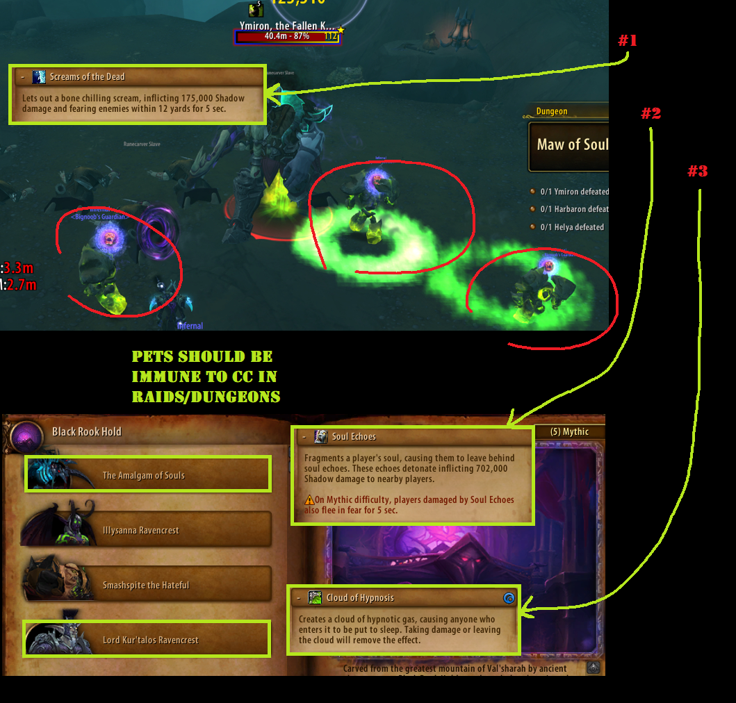 Also pets get feared when they should be immune to fear. For example on first boss in maw of souls or first boss in black rook hold.