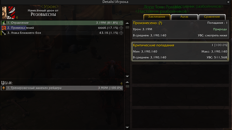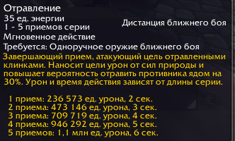 | Description | Урон https://ru.wowhead.com/spell=145416/%D0%BE%D1%82%D1%80%D0%B0%D0%B2%D0%BB%D0%B5%D0%BD%D0%B8%D0%B5 на 7.3.5 должен скалироваться согласно формуле (60% от силы атаки) * количество комбопоинтов. У роги сила атаки равна агиле, т.е "ловкость 52500 = сила атаки 52500. При расчете урона на тултипе (при наведении на спелл на панели) учитывается искусь, но не учитывается верса. Исходя из этого сделаем расчет на основании роги на х100. Заранее упомяну, что урон оружием равен 99563 Ловкость = сила атаки 52293 Искусность = 287,74% --------- ((52293*0,6)*5) + 287,74% = 608282.6346 ед урона. Показания тултипа - 1.1кк Пересчитаем заменив силу атаки на урон оружием ((99563*0,6)*5) + 287,74% = 1158136.7286 --------- Как вывод подозреваю два варинта: 1. Идет неправильная формула расчета урона для отравления 2. Расчет урона идет по урону оружием, вместо силы атаки | ||||