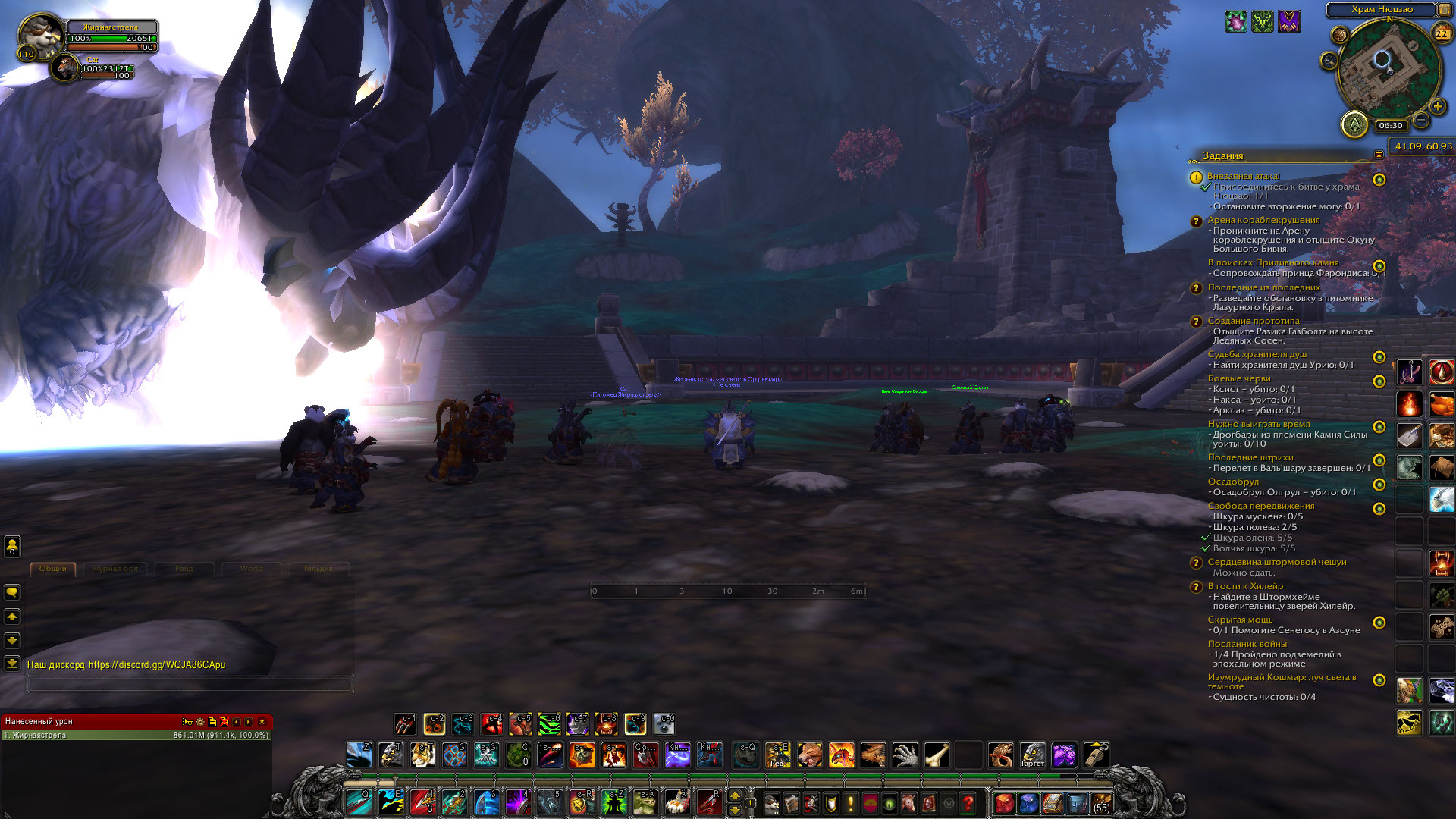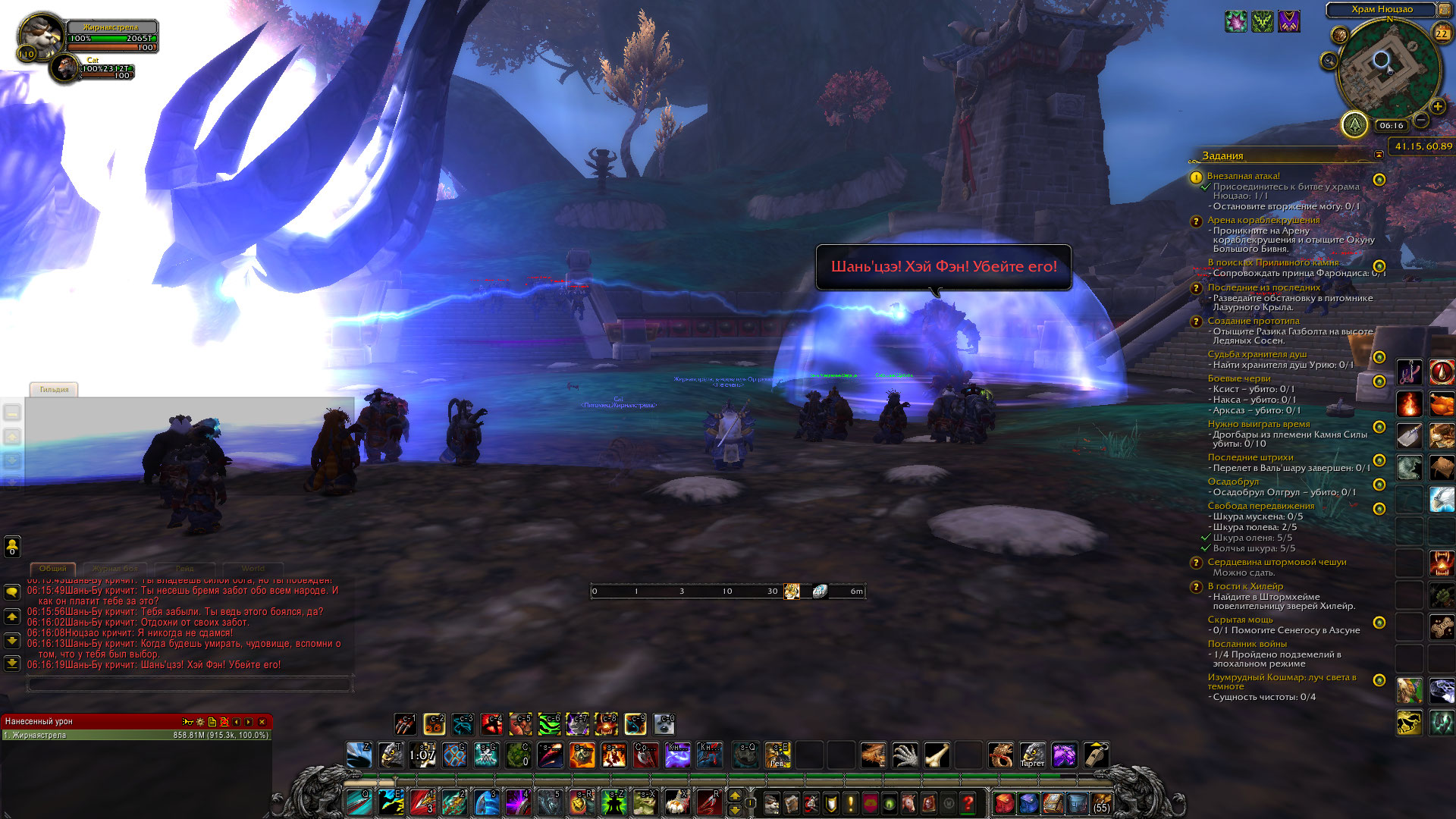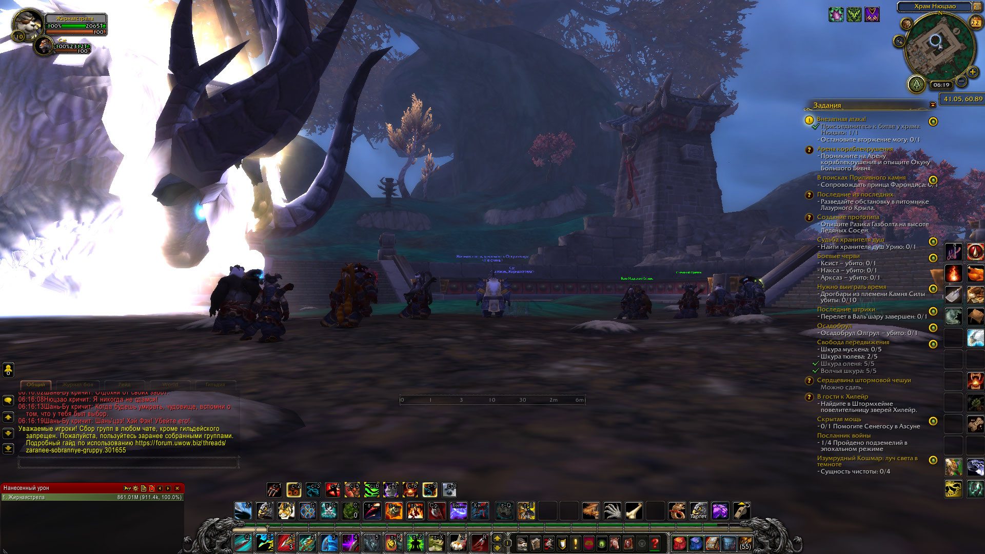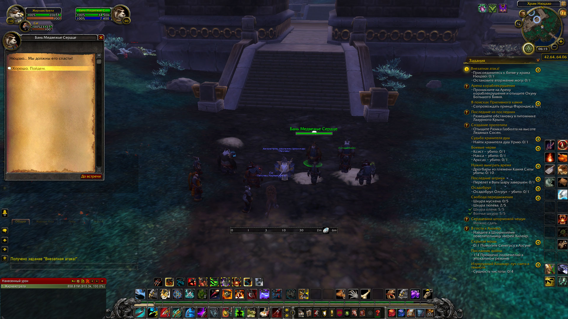 | Description | После разговора с Бань Медвежье Сердце, прохожу за ворота Храма Нюцзао. Начинается диалог между Нюцзао и Шань-Бу, после идут 4 волны мобов, после убийства мобов ничего не происходит. Ждал 10 минут, но NPC Хэй Фэн, 63920 не появляется. | ||||