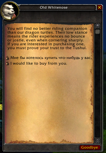 | Description | Dragon Turtle vendor in Stormwind doesnt have any listings/items to sell, and also has two options to access his items. | ||||