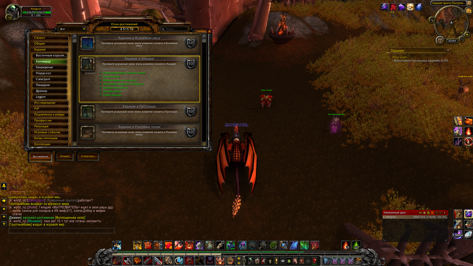 Добрый вечер, завершил достижение и данное задание путем просьбы низкоуровневого персонажа расшарить данный квест с доски приказов. Пожалуйста, сделайте так, чтобы в дальнейшем игроки не испытывали дискомфорт с такими проблемами. Ведь я не обязан брать все квесты с доски и летать по всему континенту, чтобы получить нужный низкоуровневый потому что качался другим способом (без доски приказов) , как описывал вышеупомянутый игрок. |