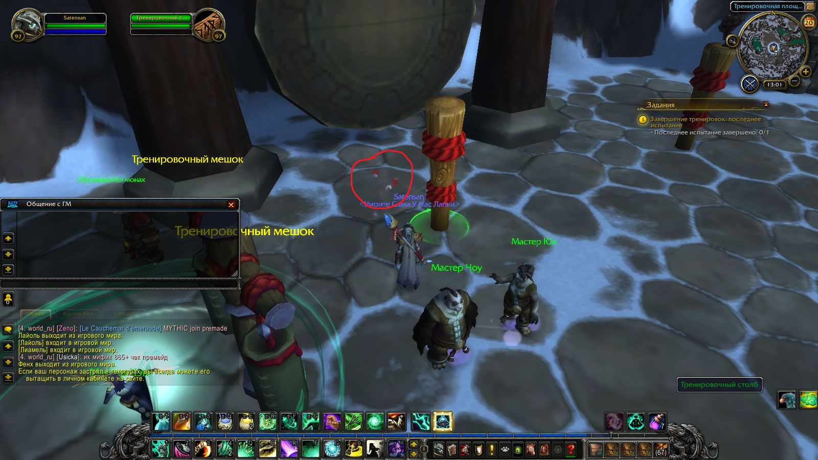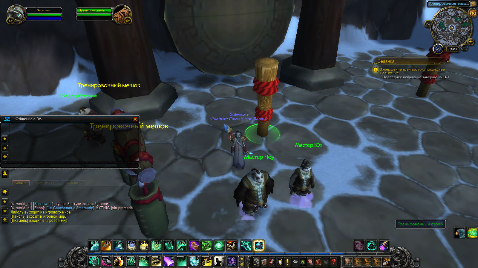 | Description | При запуске квеста Завершение тренировок: последнее испытание, исчезает нпс Мастер Хайт, на его месте сначала ничего не было, потом появился тренировочный столб и появилось некое красное мерцание, попытаться решить проблему самостоятельно я не решился,и написал тикет в помощь, там меня отправили в багтрекер | ||||