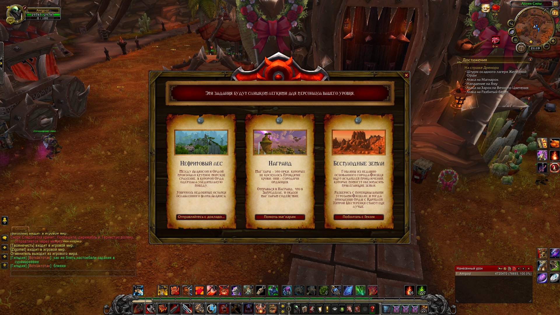 Добрый день, подтверждаю информацию о вышеупомянутых фиксах, взял квесты и успешно получилось их сдать. Данный квест выполнен тоже, но остался висеть. Есть еще один квест с доски приказов, но почему-то не везде отображается. Награнд Дренора с доски приказов можно взять только в Гарнизоне. Но дело в том, что все квесты в данной локации выполнены и фаза уже поменялась, Поэтому сдать его невозможно. |