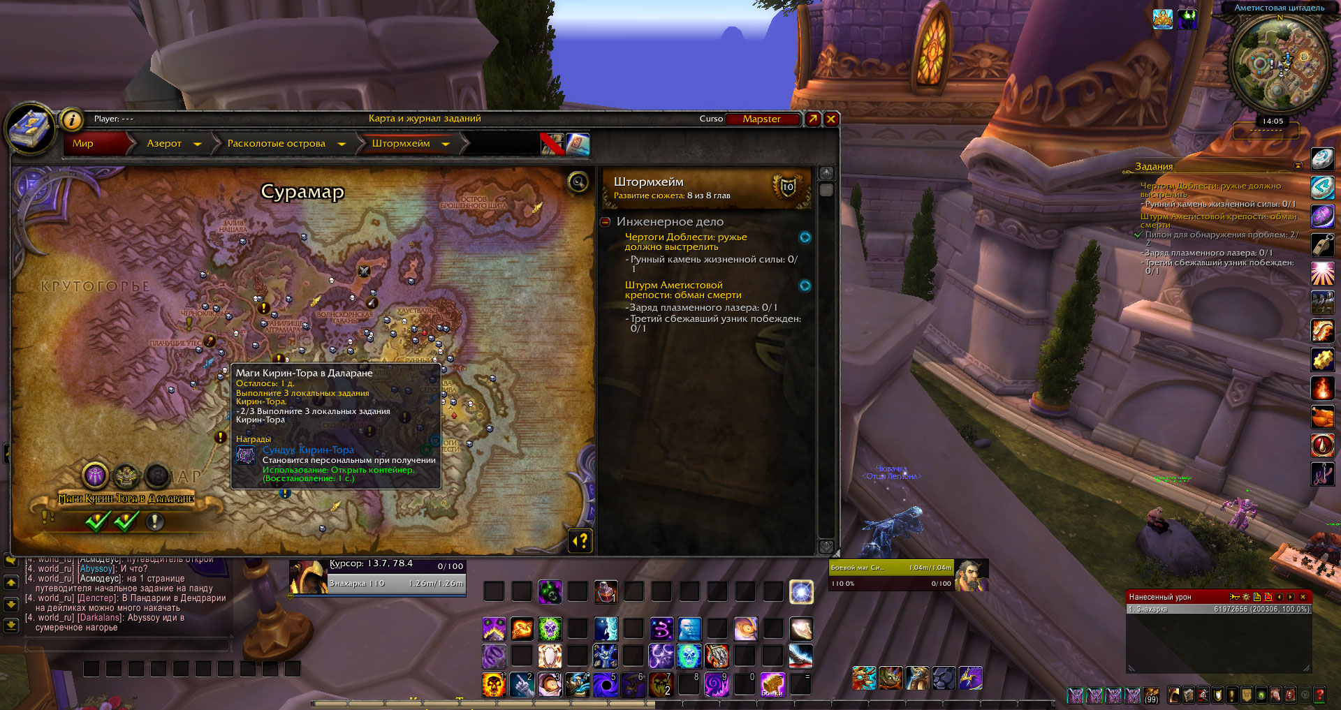 И вообще у меня на этом персонаже какие то проблемы с локальными заданиями магов Кирин тора. Есть задание выполнить три их задания. Облетела все локации расколотых островов, нашла 2 задания сделала. А третьего просто нет. пошли уже вторые сутки и оно не появляется. На других персонажах на этом же акаунте таких проблем нет.
